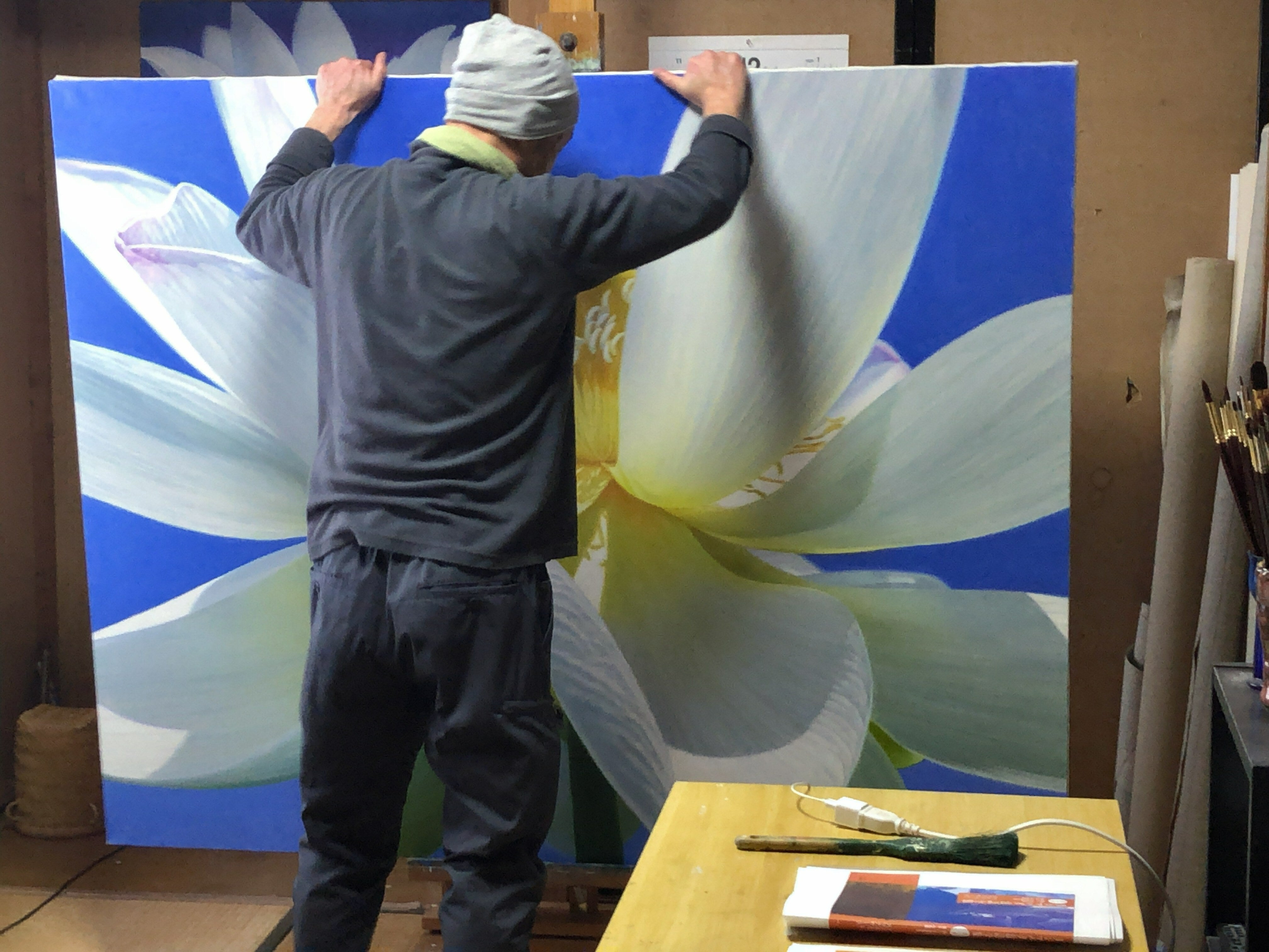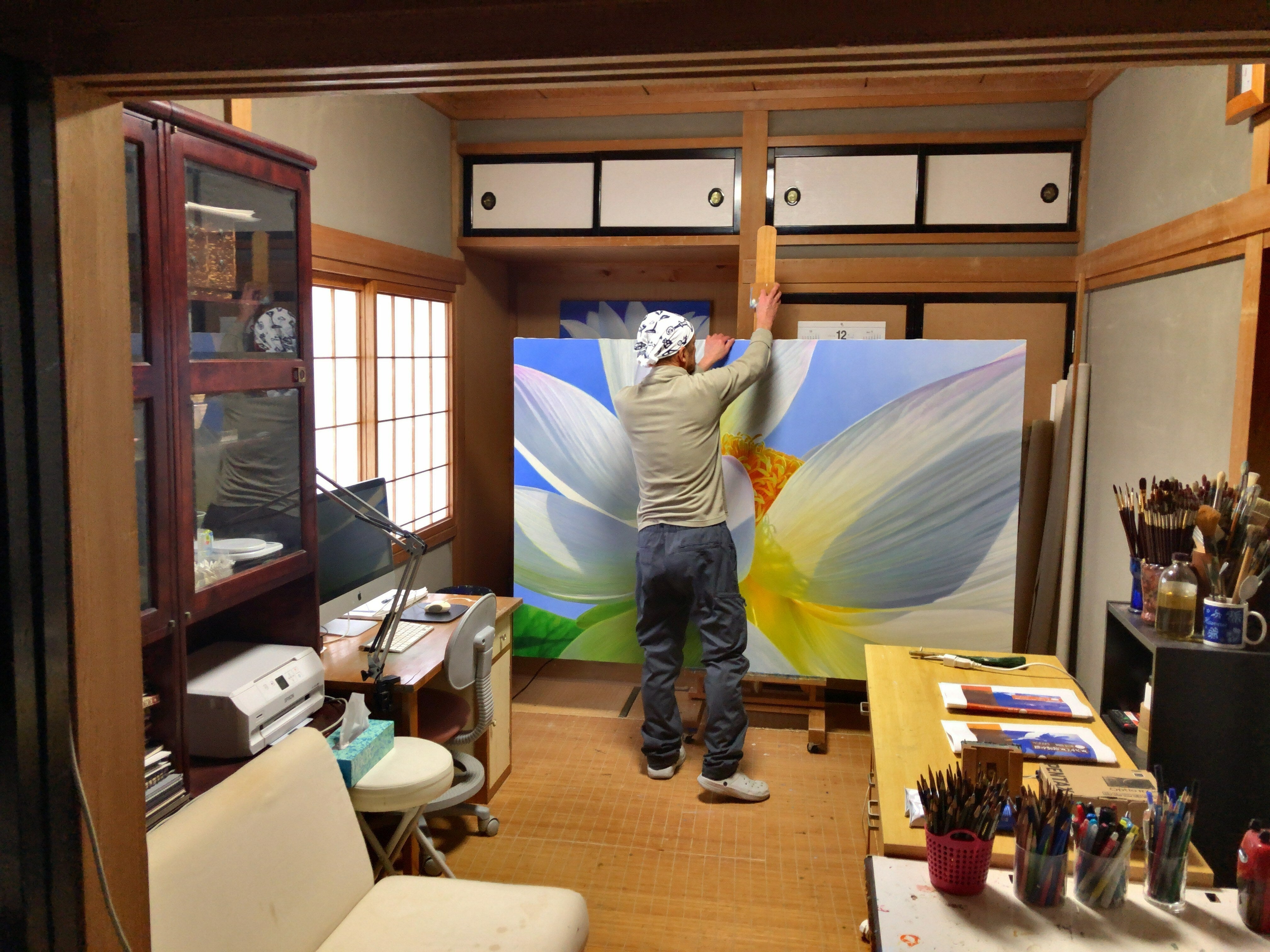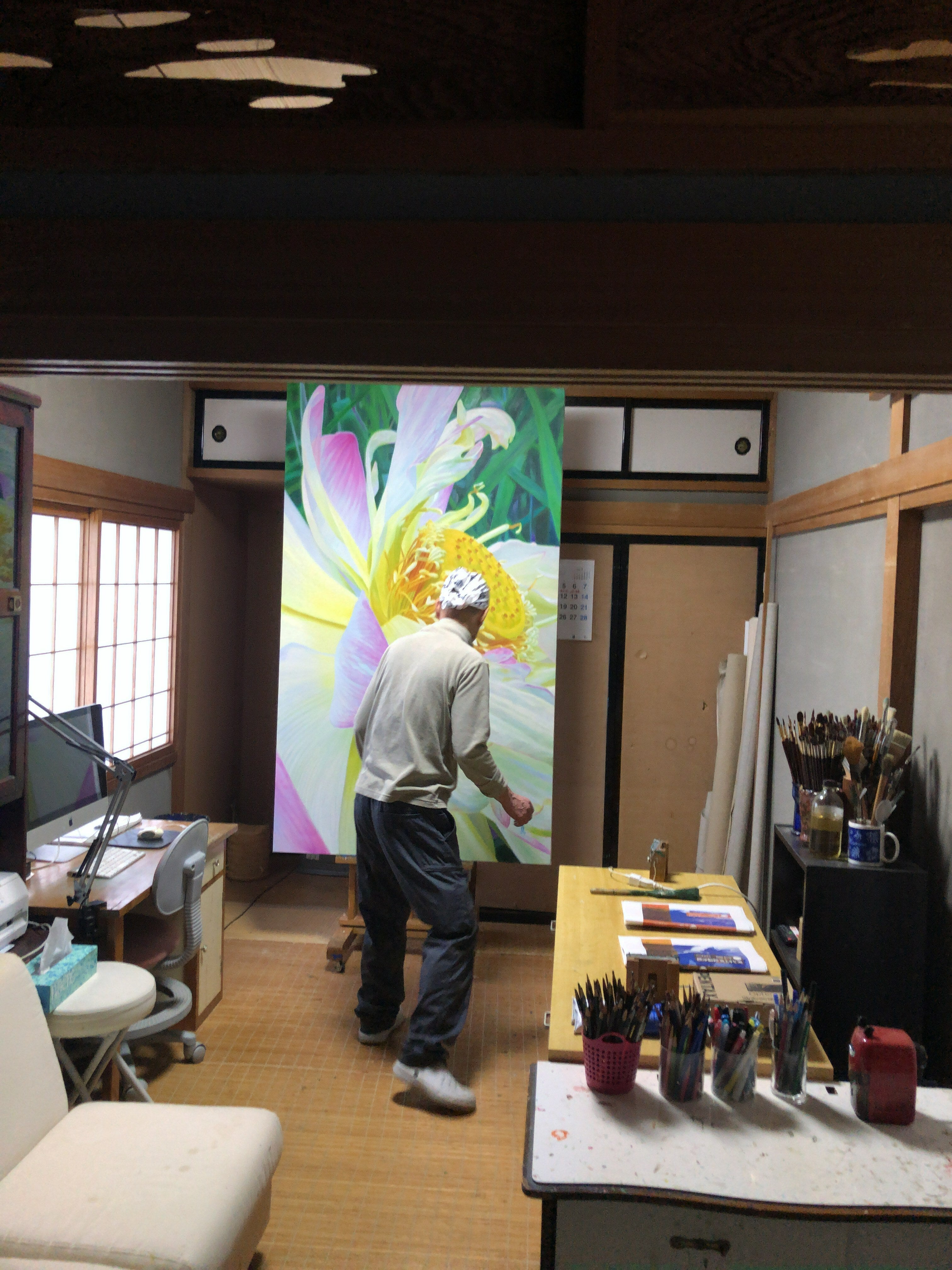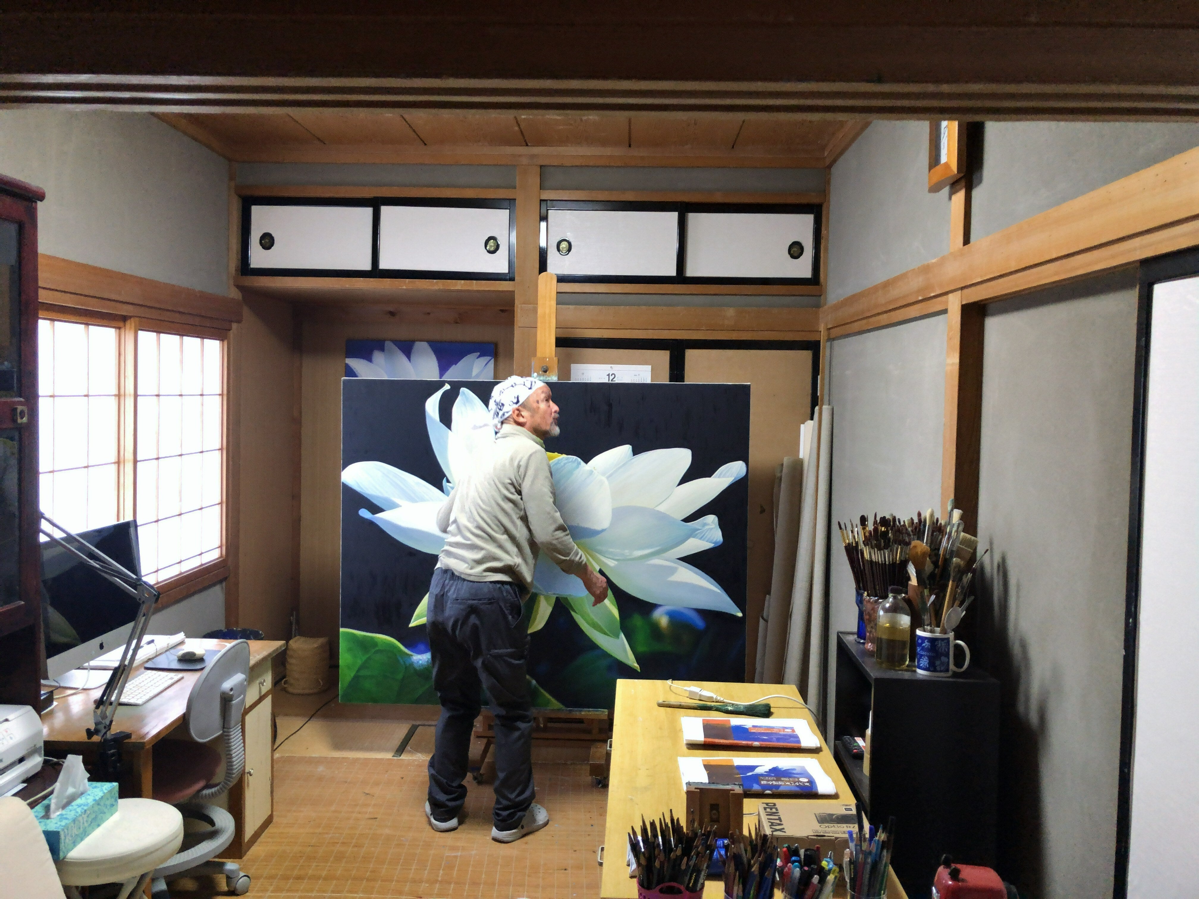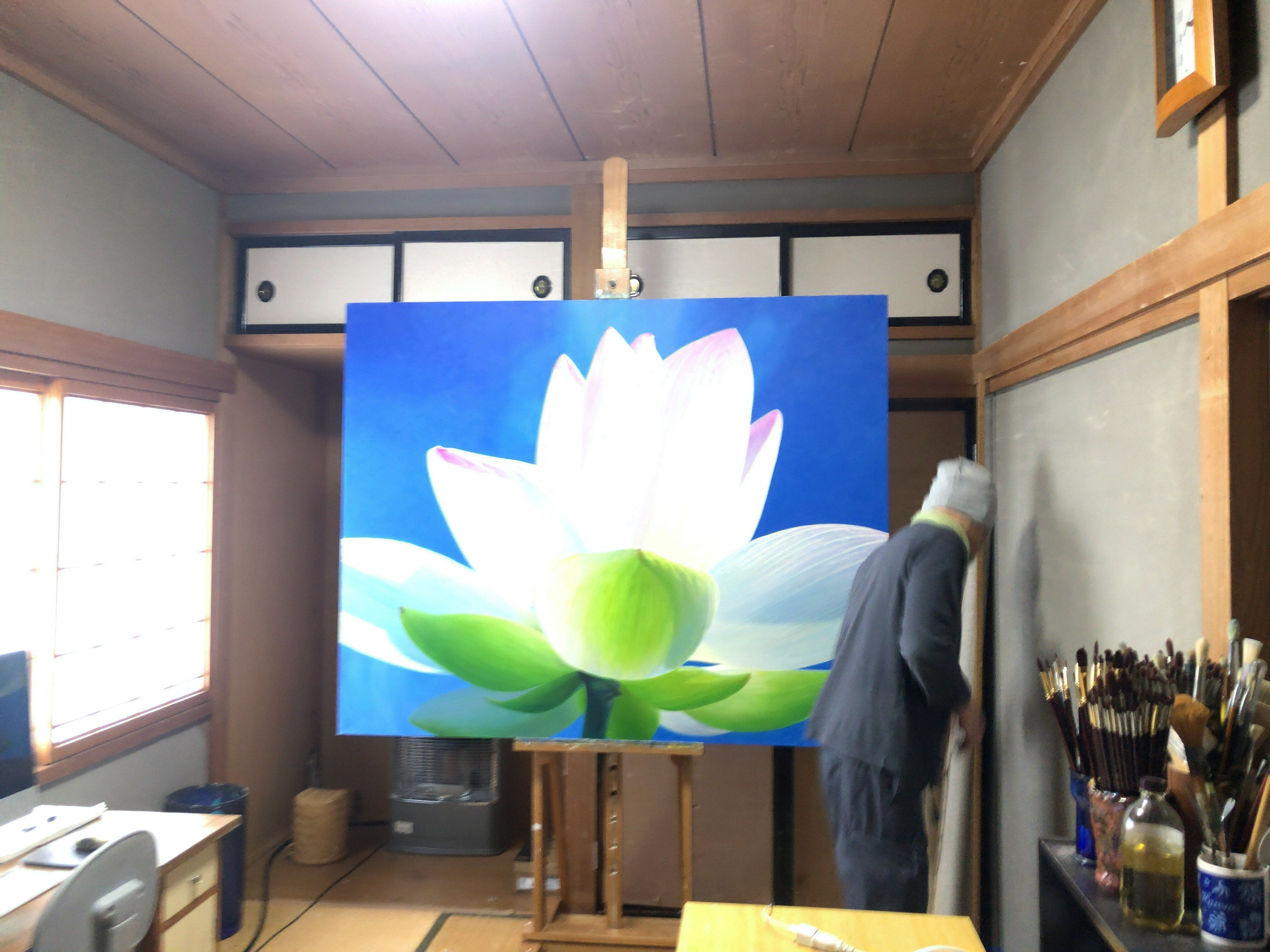 二階のアトリエに登ると、たくさんの蓮の絵が並んでいました。