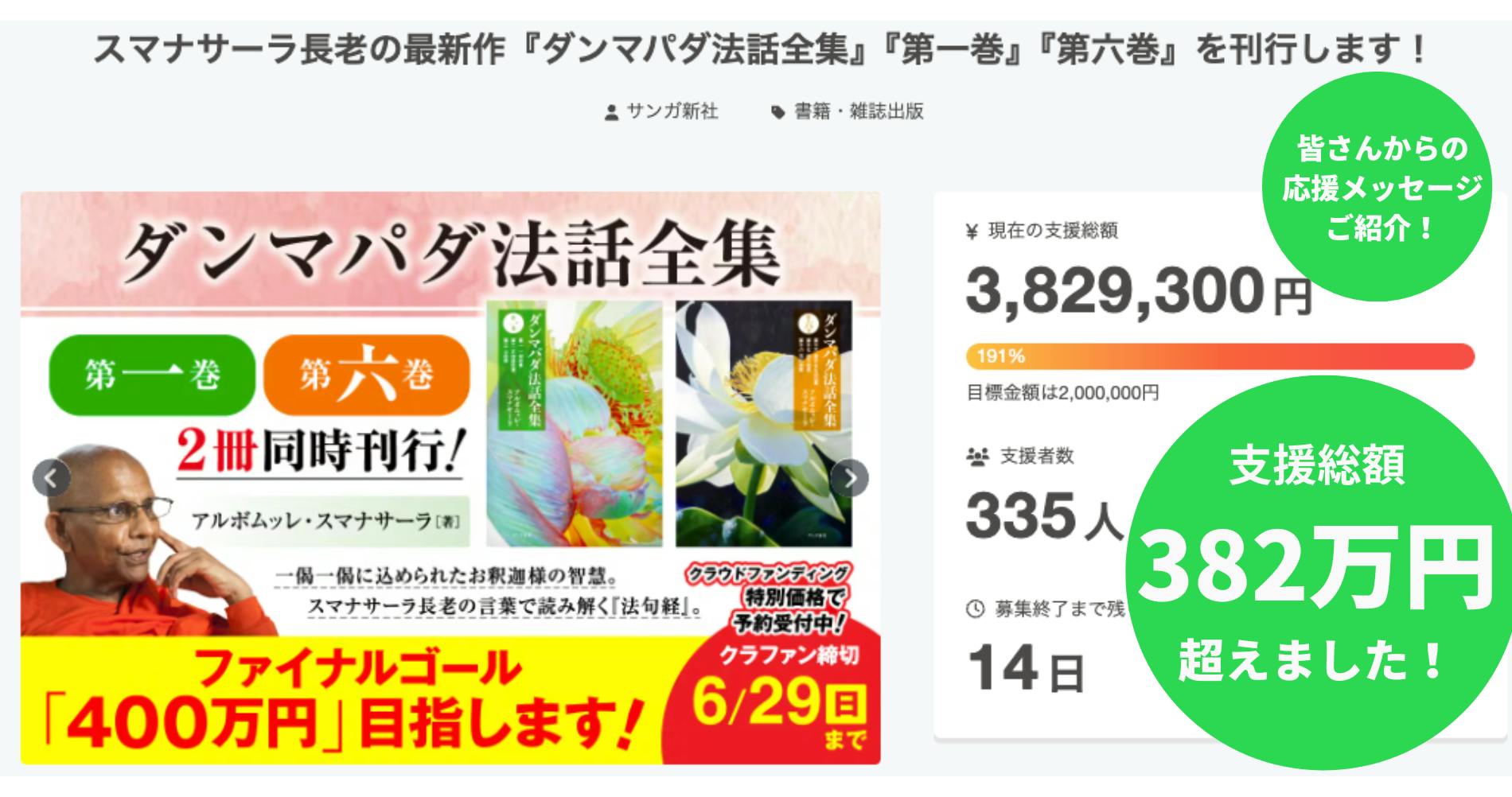 5月17日(土)にスタートした「スマナサーラ長老の最新作『ダンマパダ法話全集』『第一巻』『第六巻』を刊行します!」クラウドファンディングは、目標金額200万円、そしてネクストゴール300万円を突破し、現在、ファナルゴールとして「支援金額400万円」を目指しています。