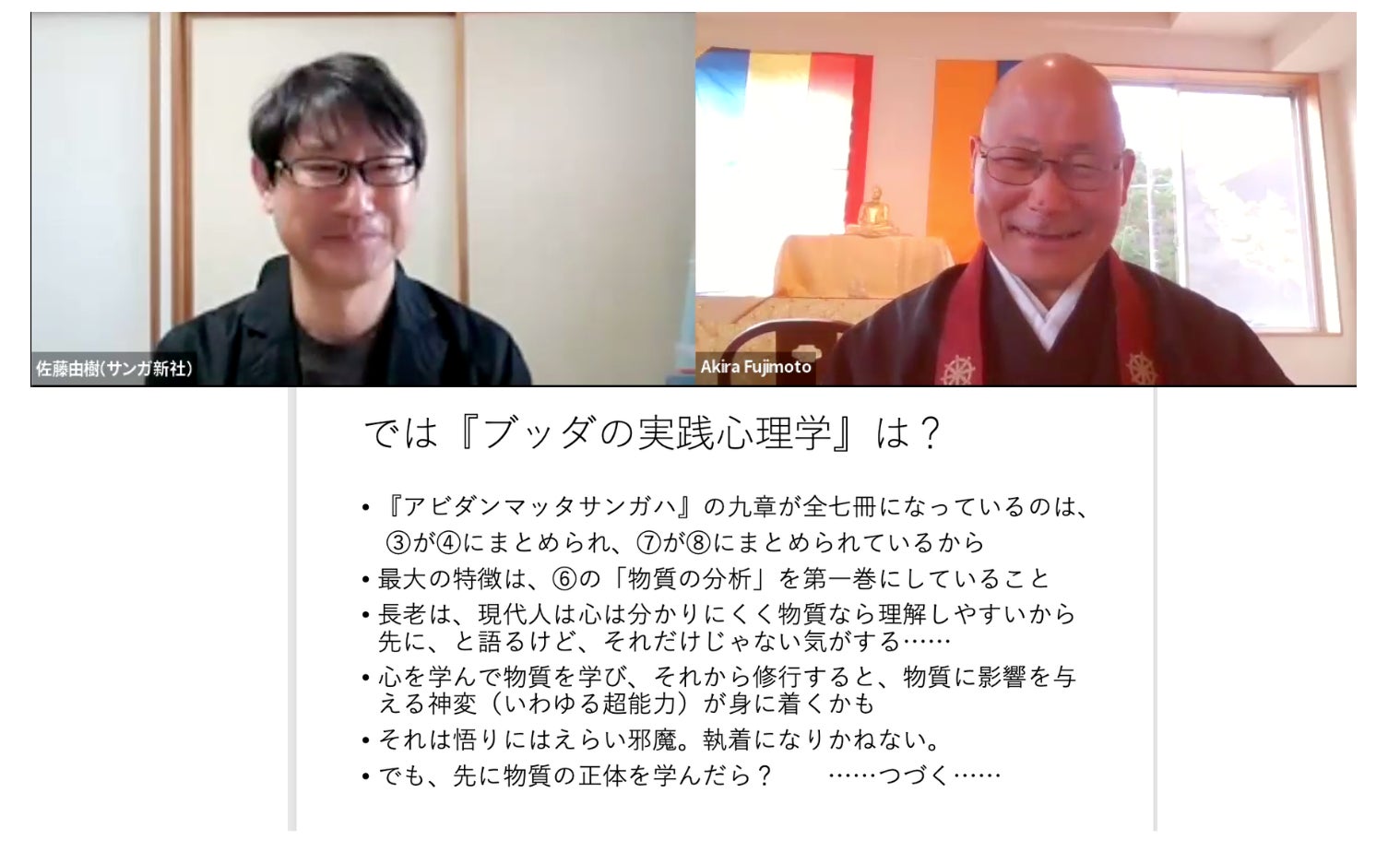 また昨日は、共著者である藤本晃先生によるクラファンスタート記念オンラインセミナー「はじめての『ブッダの実践心理学』」を開催し、50名以上の方にご参加いただきました。