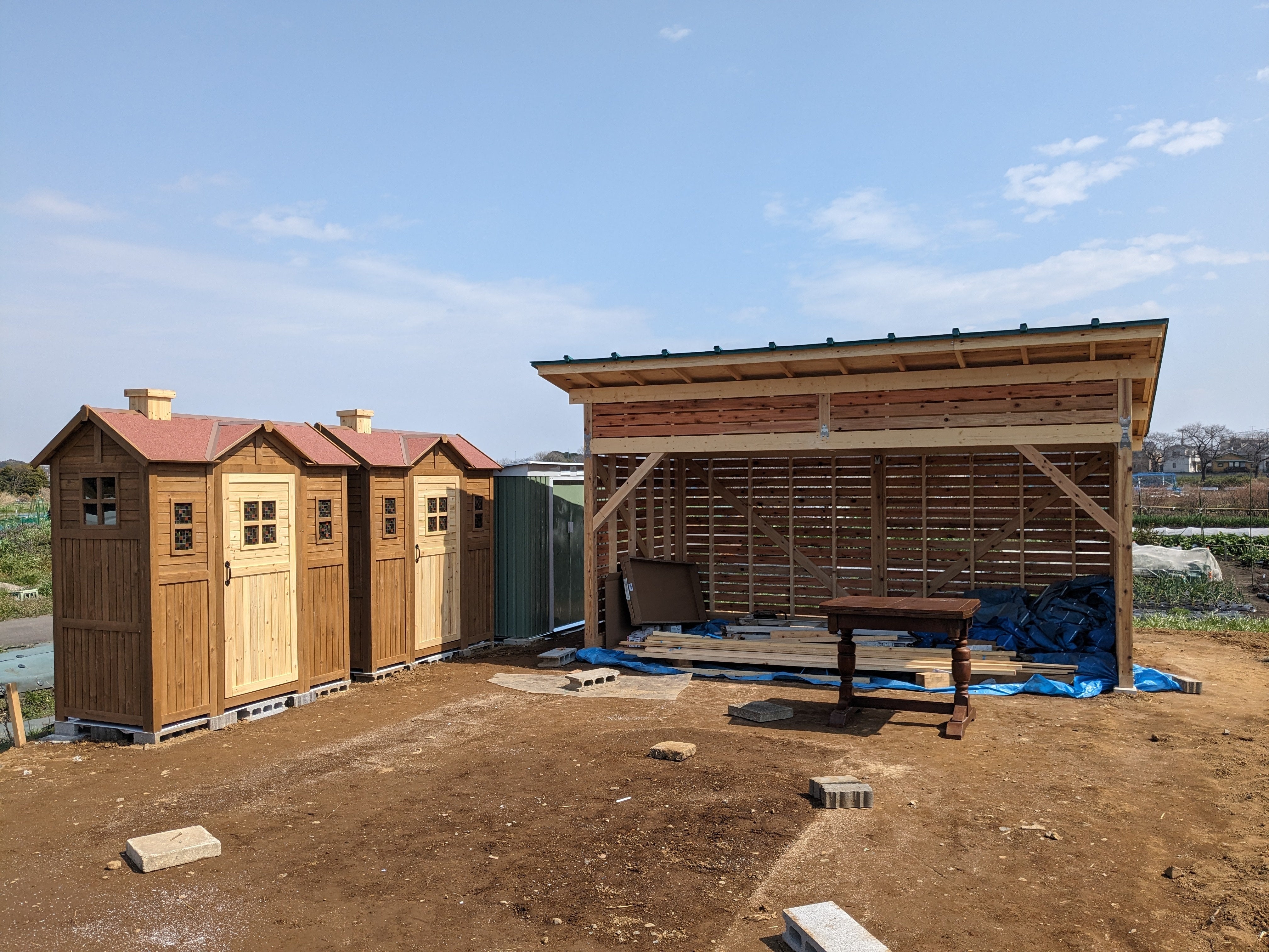 バーゴラと洋風物置の建設の様子その土地利用の計画について行政との調整、申請も進めており、4月の開園予定に向けて作業を進めております。