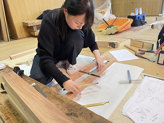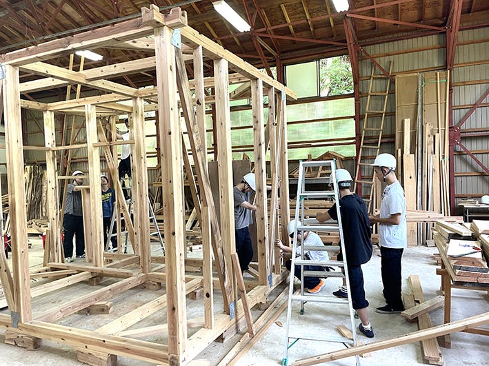 木造建築・木工品製作の修得に励む工科短大生と作品例
