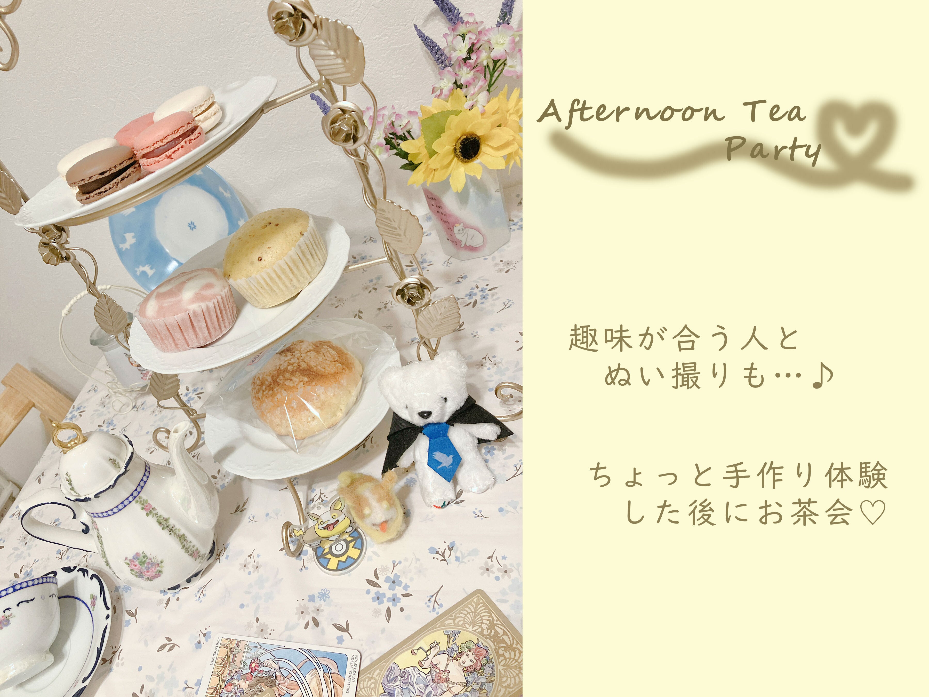 2024/02/29 00:39ポーセラーツサロンろすろ です!今回アフタヌーンティーのイメージとして食器やエタージェラにマカロンなどのお菓子を乗せて雰囲気を演出してみました!今後ヨーロピアンなアフタヌーンティーだけでなく、同じ趣味や推しの集まりでお茶会を開くことも考えてぬいぐるみと撮影できる「ぬい撮り」もイメージしてみました。推しやぬいが可愛く撮影できるアットホームなアフタヌーンティー、いかがでしょうか?リターンも豪華なのでご興味がございましたらご支援ください! もっと見る