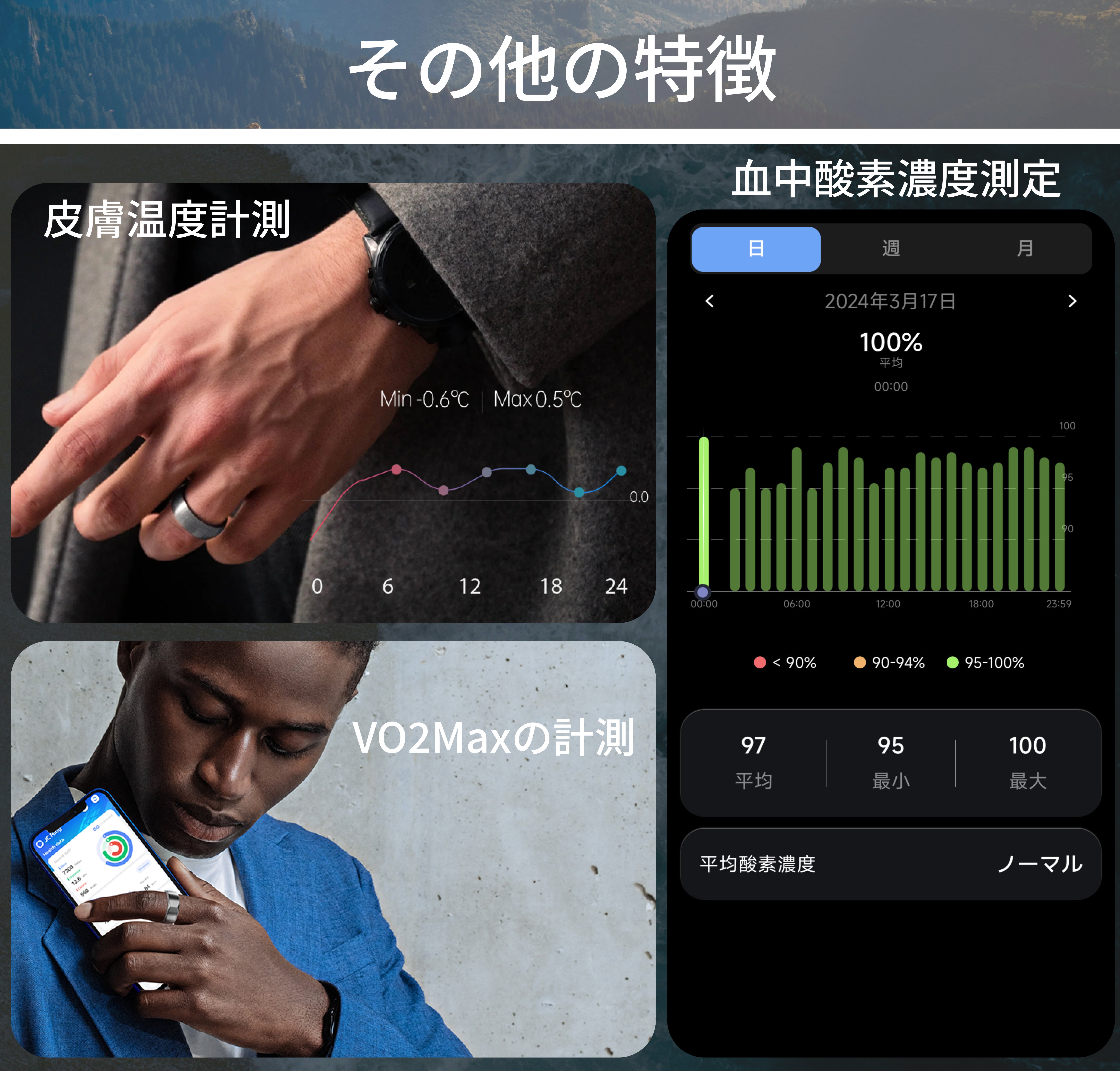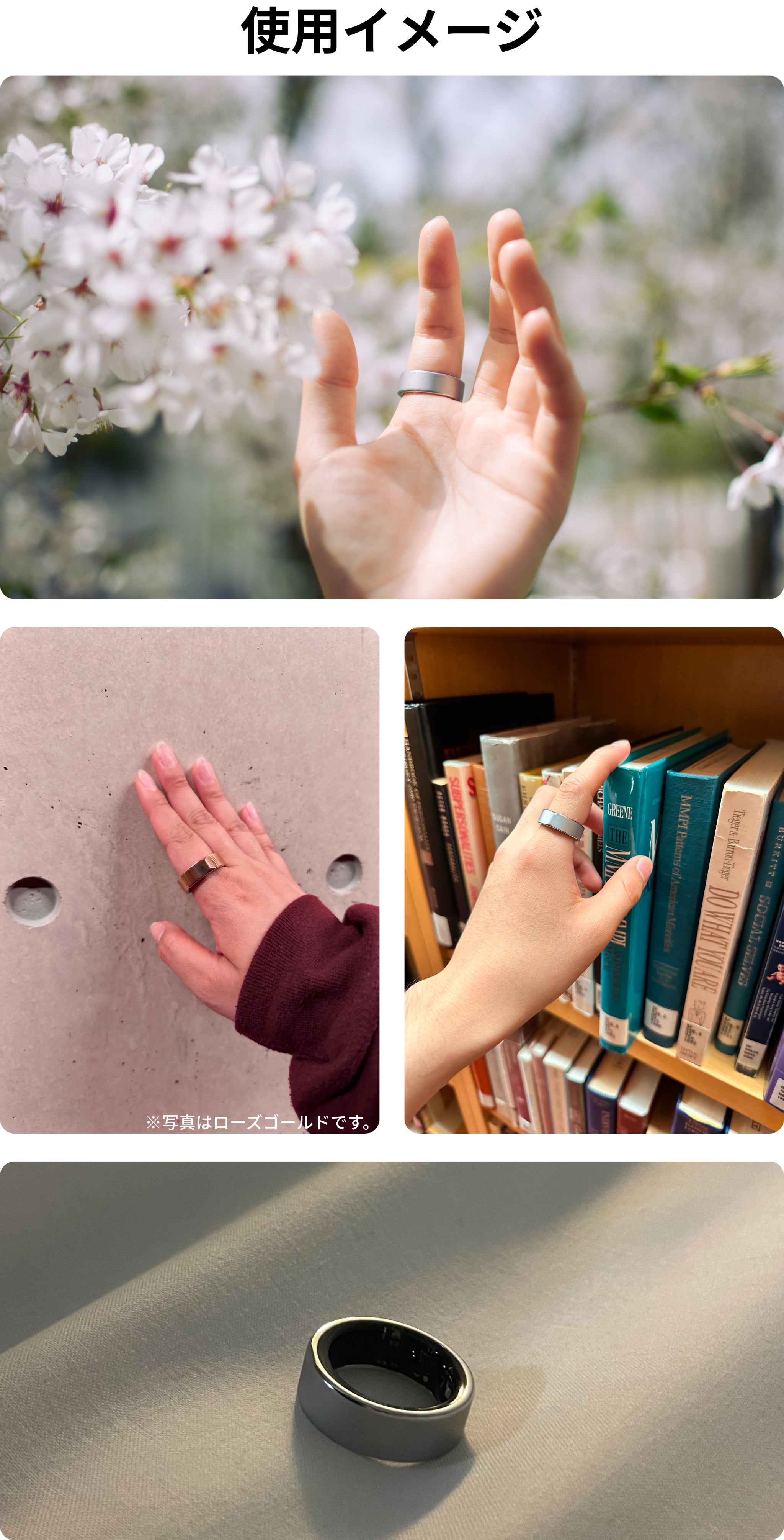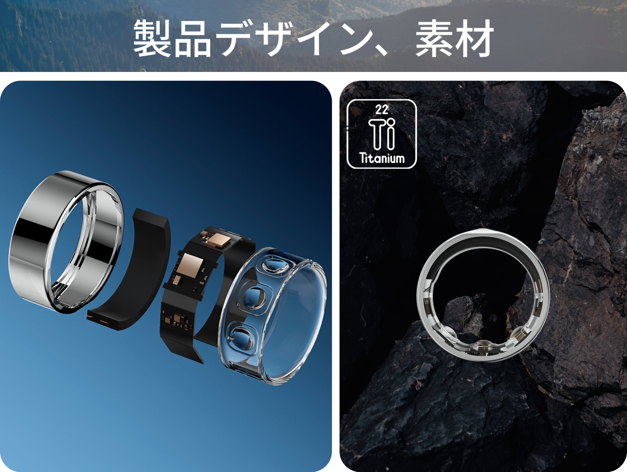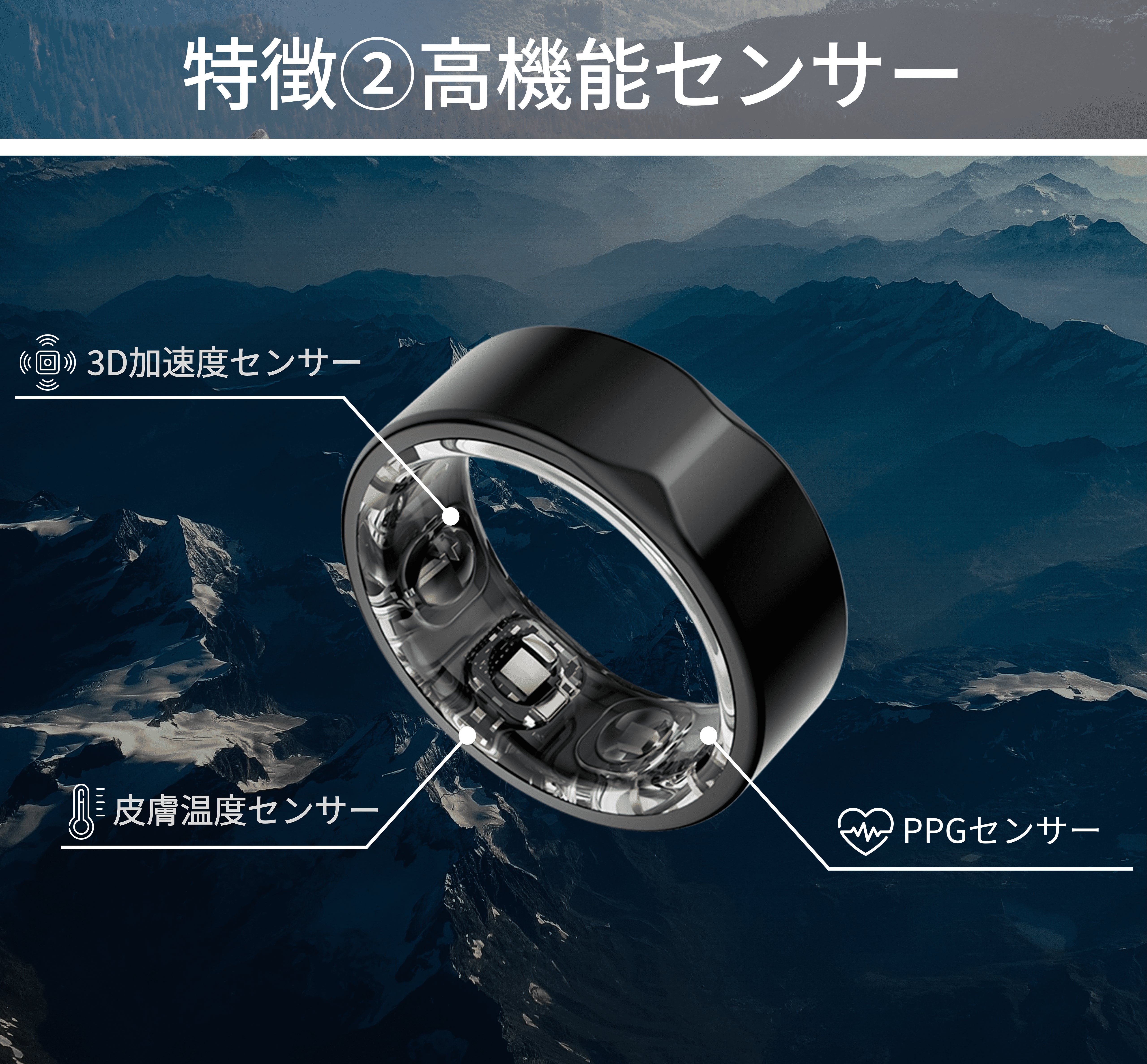 リング内部に搭載された3つの高機能センサーが、独自のアルゴリズムを用いて日々の活動を正確に計測します。