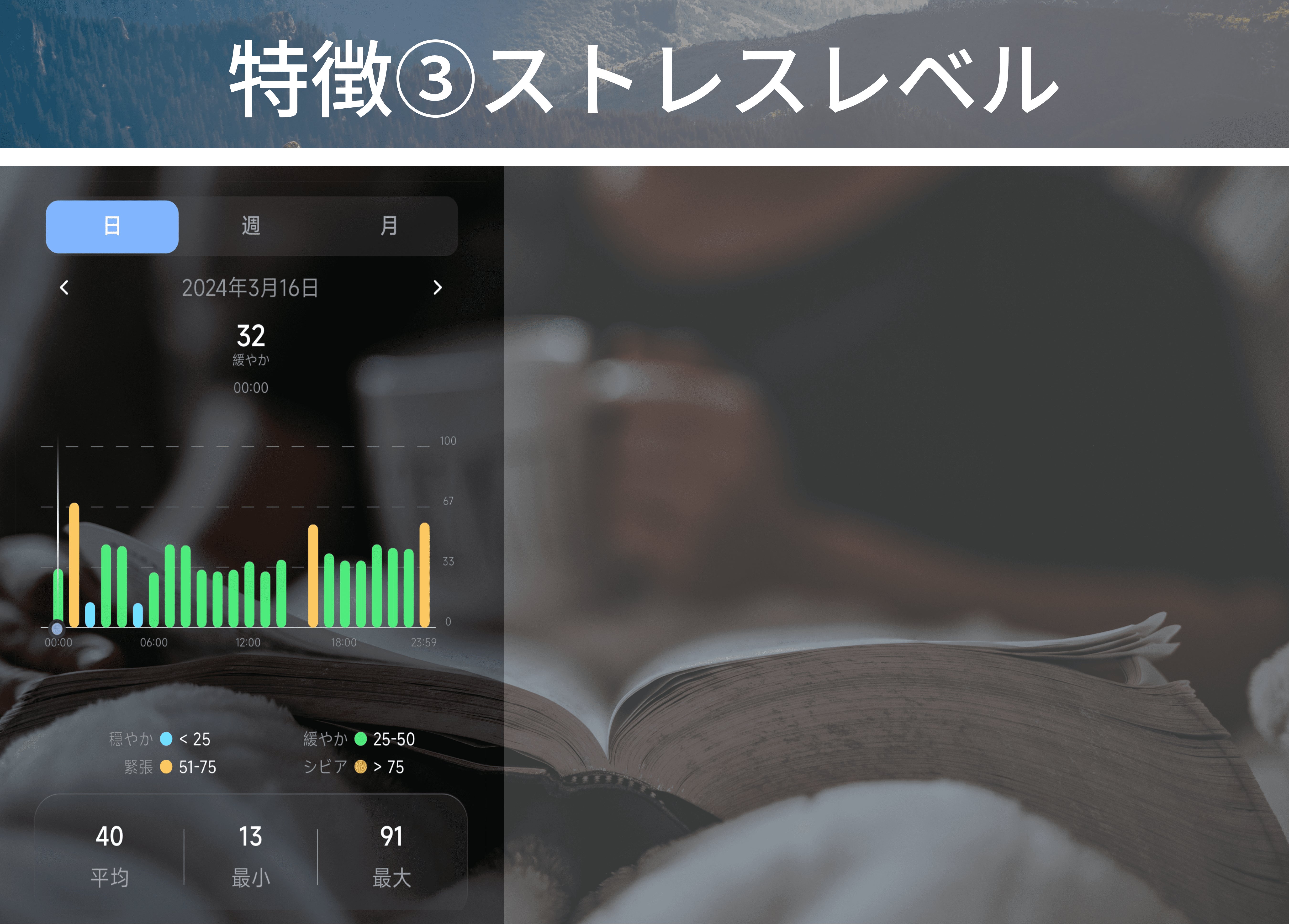 さらに、アプリ上で日・週・月の平均ストレスレベルや、それぞれの最小値と最大値、ストレスを多く感じた時間帯も表示されます。どのタイミングでストレスを多く感じたのか、この機能を通じてあなたのストレスレベルを的確に把握し、適切な対処方法を見つけてみましょう!