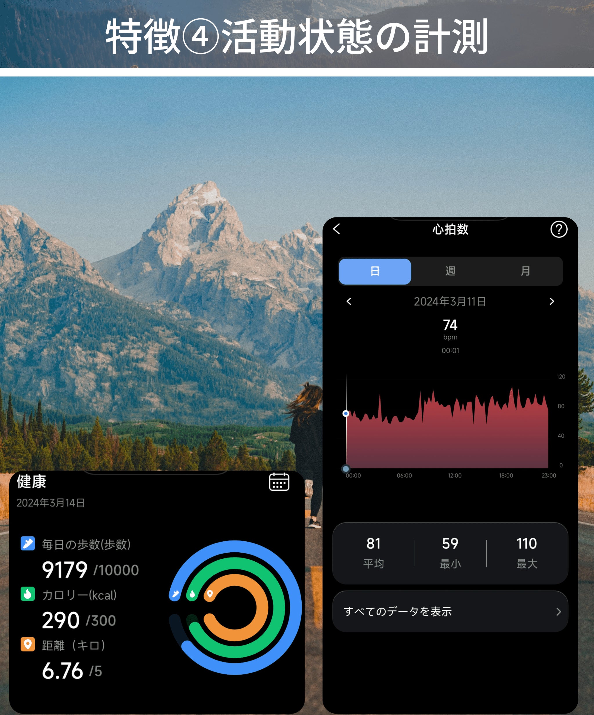 また、アプリ上で目標の歩数を設定すると、目標達成までの進捗を追跡し、必要に応じて強化すべきか知らせてくれます。さらに、心拍数も計測し、身体活動の効果や心拍数の変動も把握することができます。
