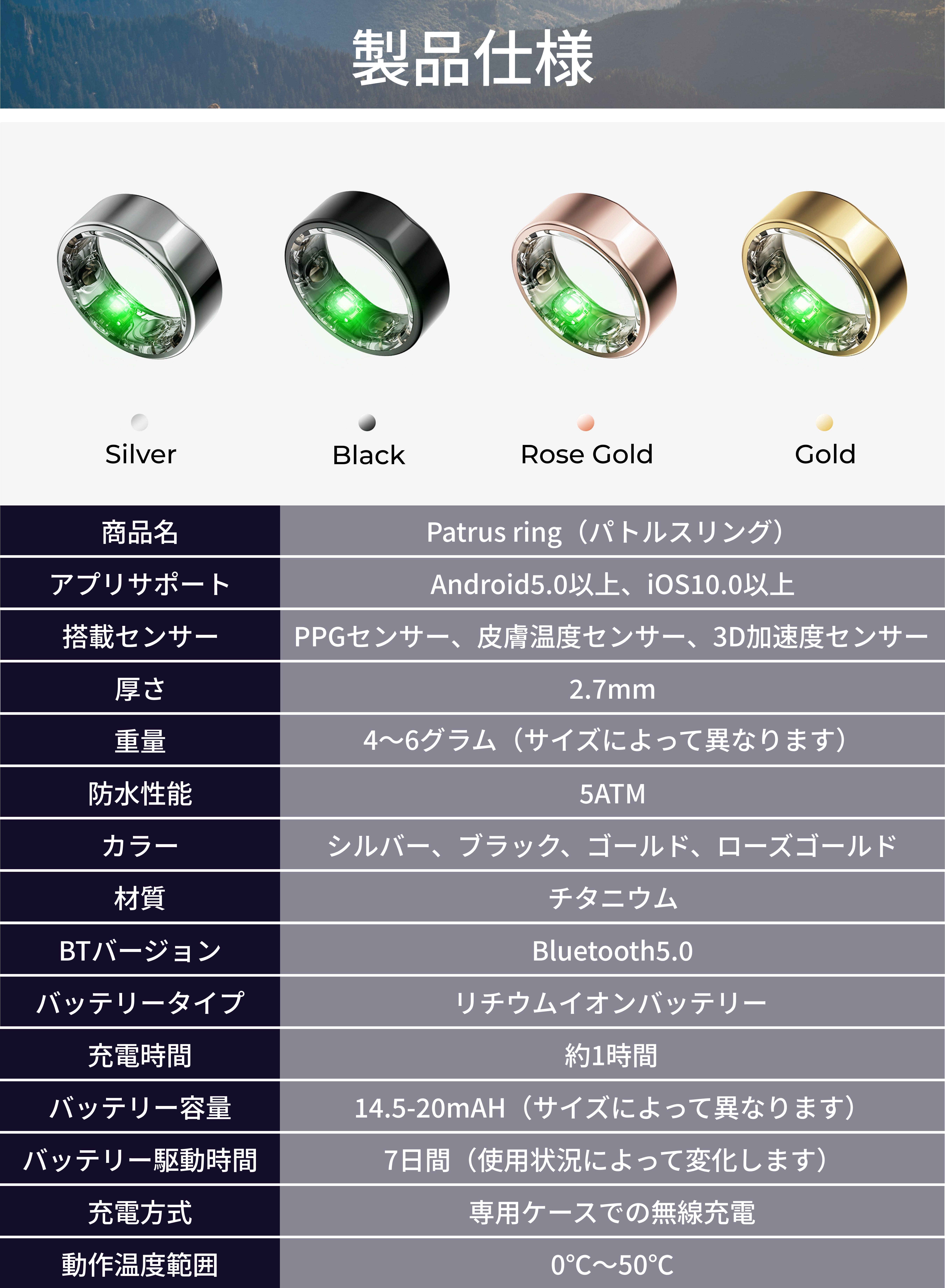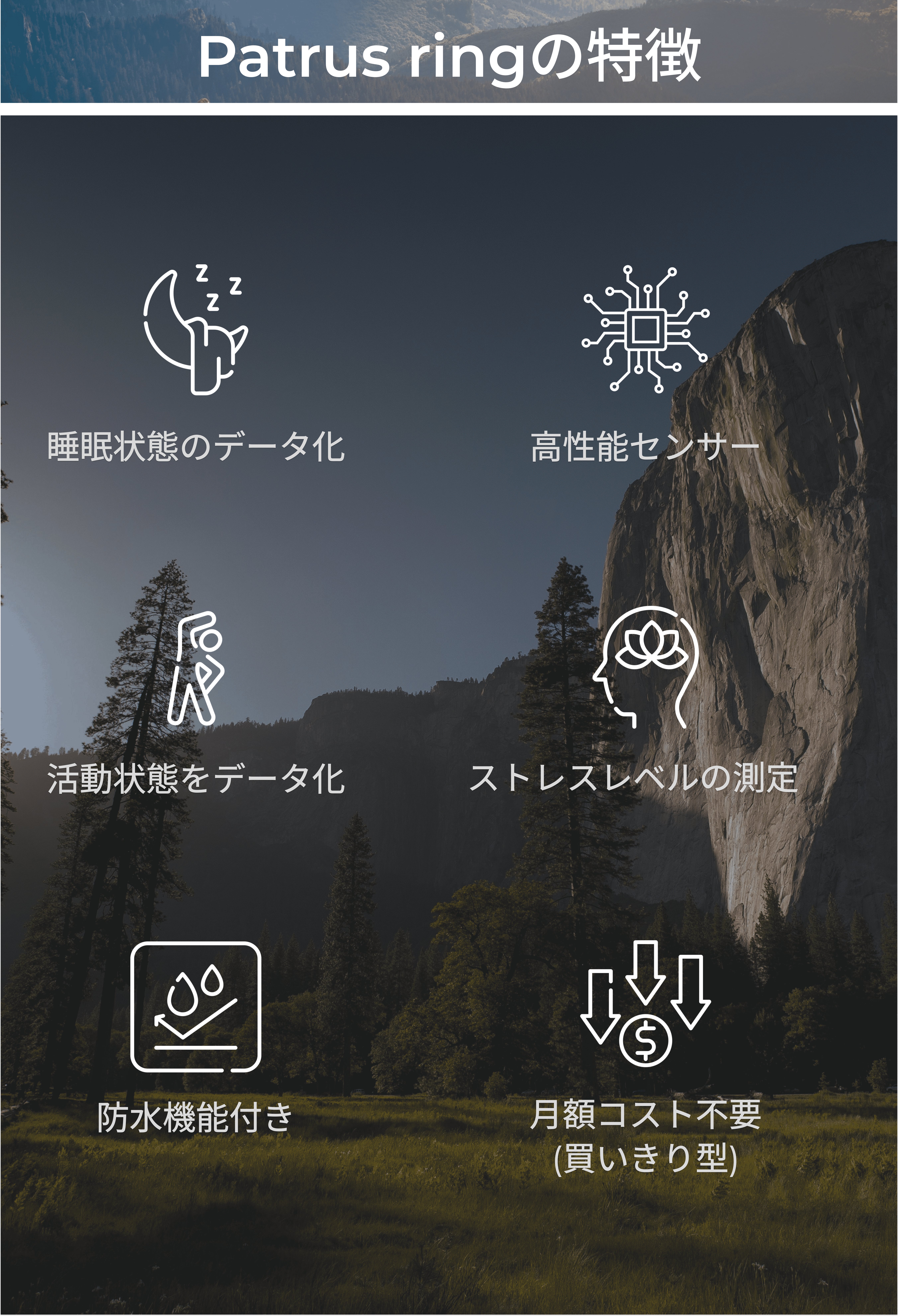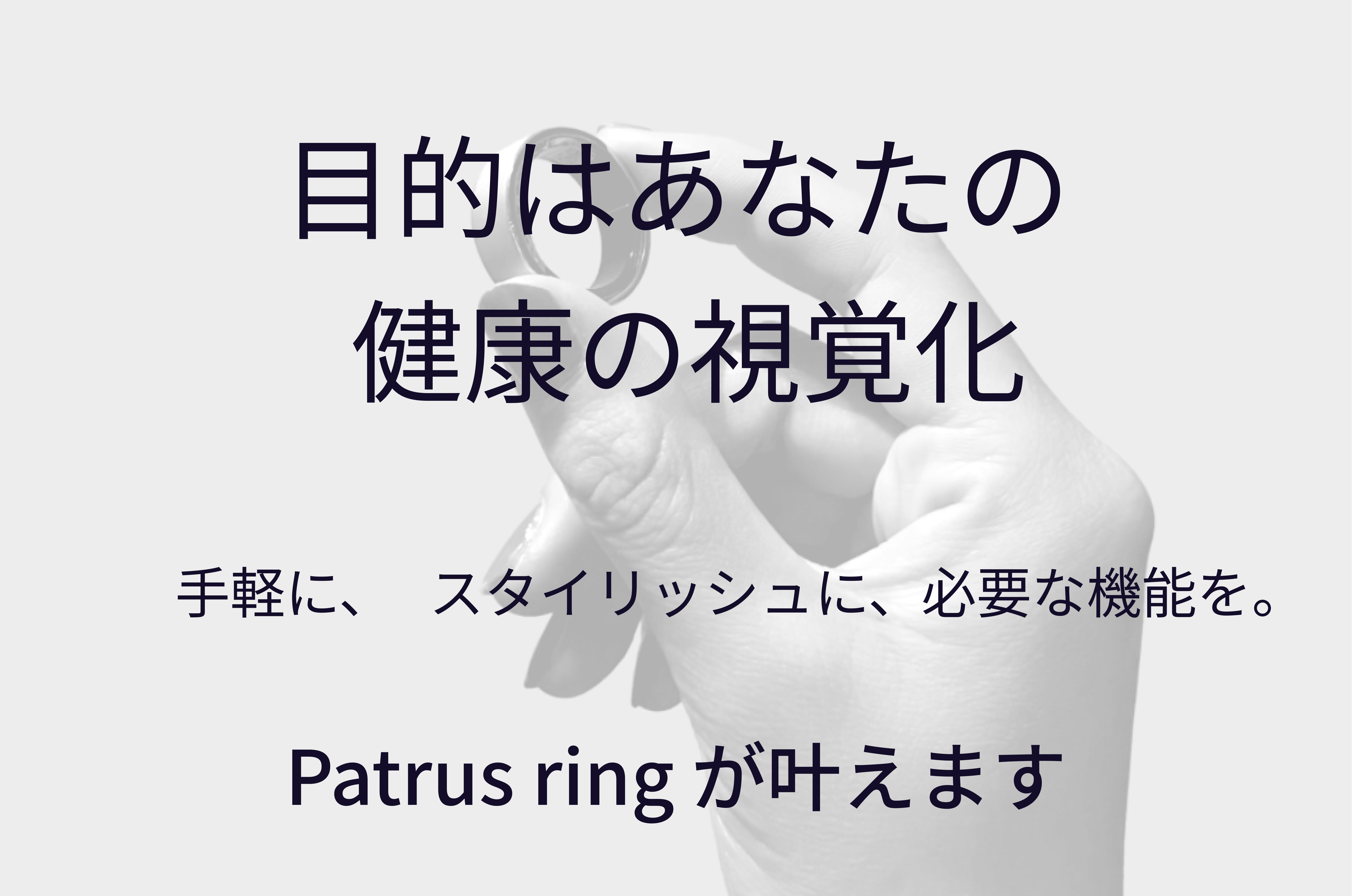 Patrus Ring(パトルスリング)は、心拍数、ストレス値、睡眠の質をチェックし、あなたの健康を常に観察します。忙しい毎日でつい忘れがちな健康への意識。Patrus Ringで、健康第一の生活をスマートに手に入れましょう!