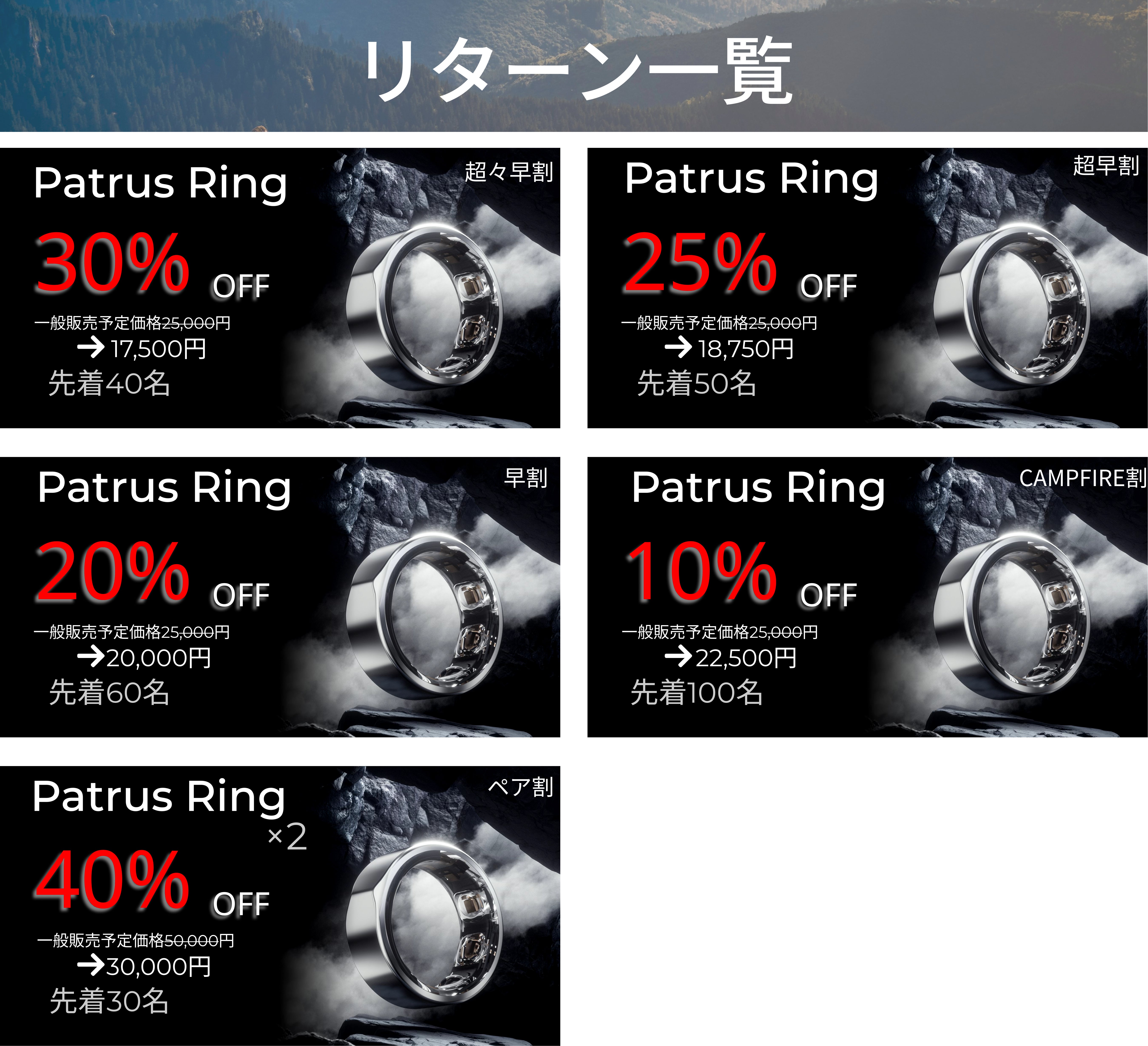 製品の一般販売予定価格25,000円のsmart ringを、以下の割引価格で、先着順で販売いたします。