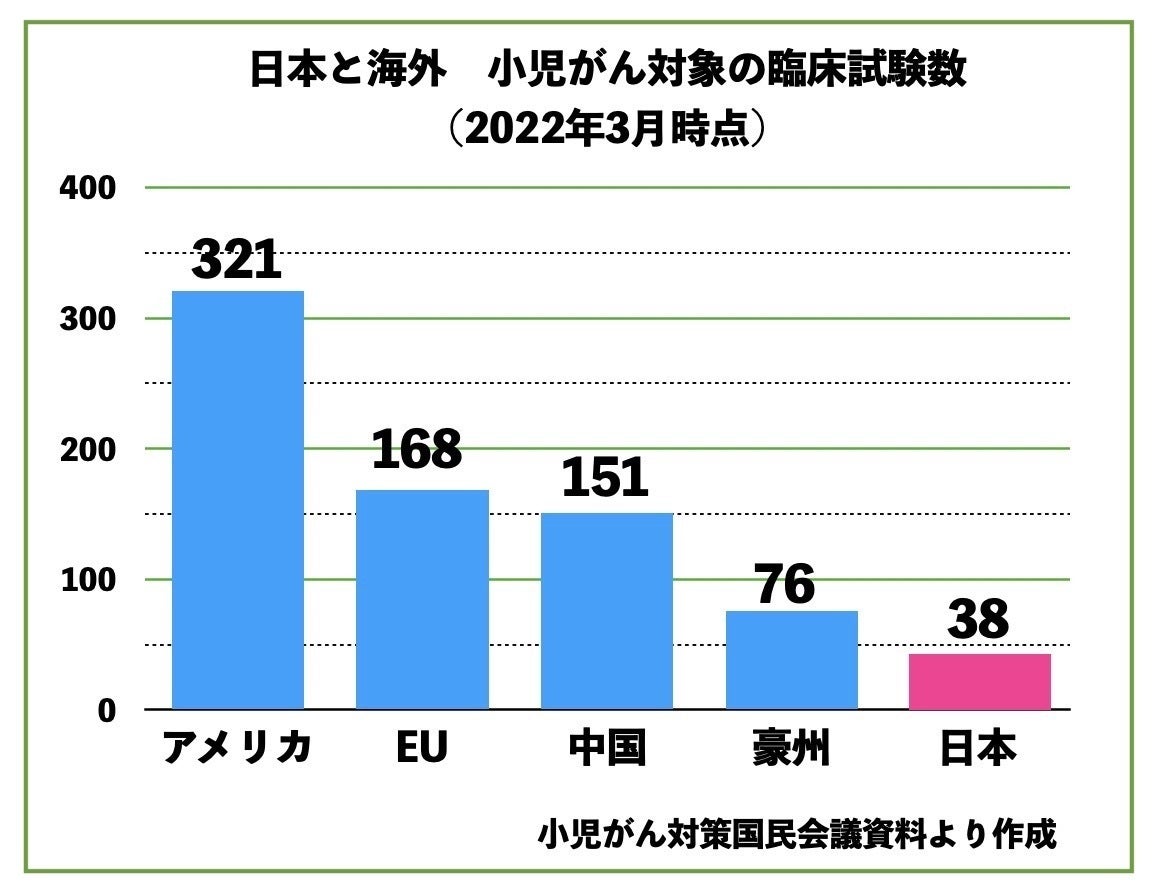 その理由は、日本国内での治療研究がほとんどされていないのと、欧米の研究機関・製薬企業から臨床試験参加の誘いがほとんど無いからです。実に年間で米国の1/9、EUの1/4程度しか日本では小児がんの臨床研究が実施されていません(図3)。