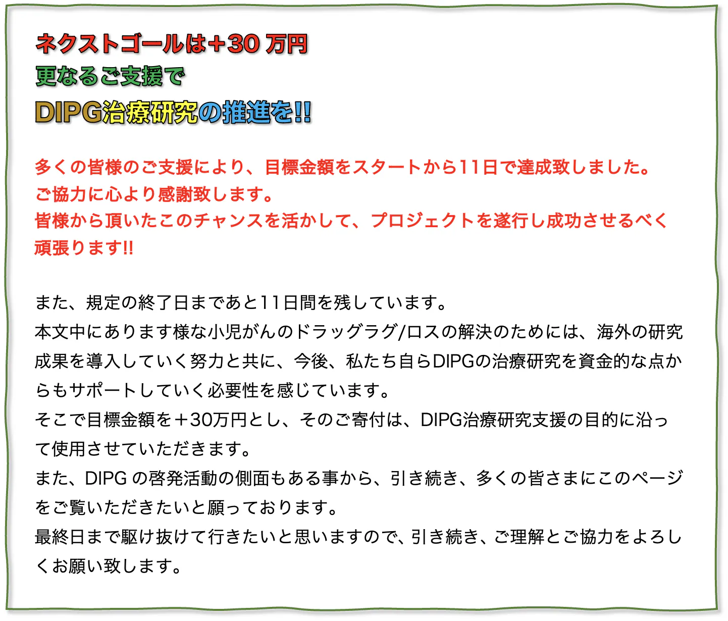 その場合、未使用ご寄付は次の機会のDIPG関係の学術会議への参加費用に致します。どうかその点をご理解の上ご了承下さい。