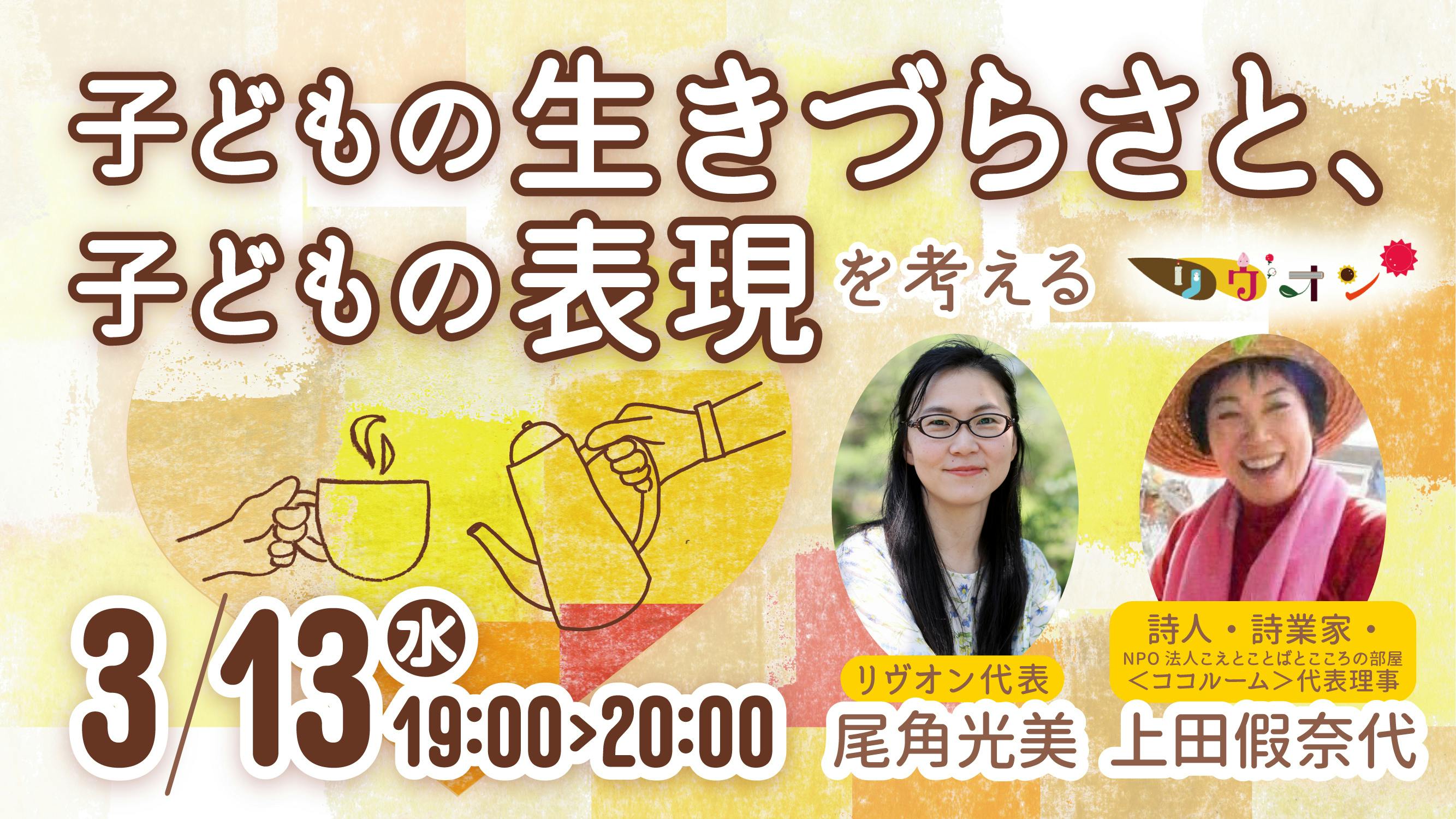 今回は、リヴオンの理事であり、ことばの表現を通して子どもから大人までたくさんの人たちと、あの手この手で地域との協働をはかる上田假奈代(うえだ・かなよ)さんをゲストにお招きして、「子どもの生きづらさと、子どもの表現を考える」をテーマにお話いただきました。
