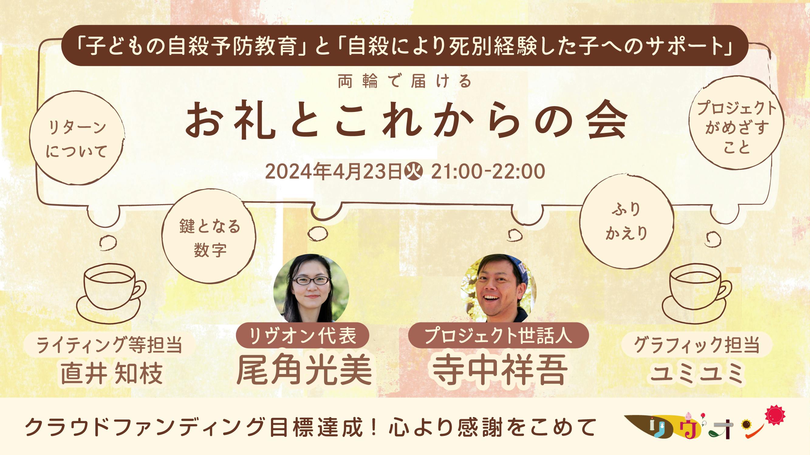 ここで、クラウドファンディングを進めてきた尾角光美(リヴオン代表)、寺中祥吾(世話人)、直井知枝(ライティング他)、ユミユミ(グラフィックデザイン)の4人で、「お礼とこれからの会」をオンライン配信します。