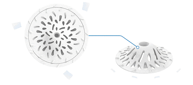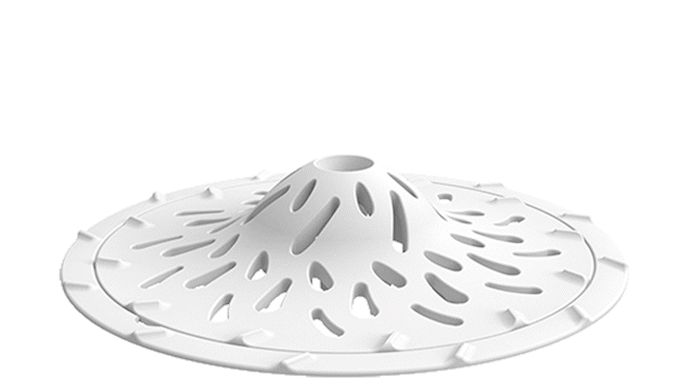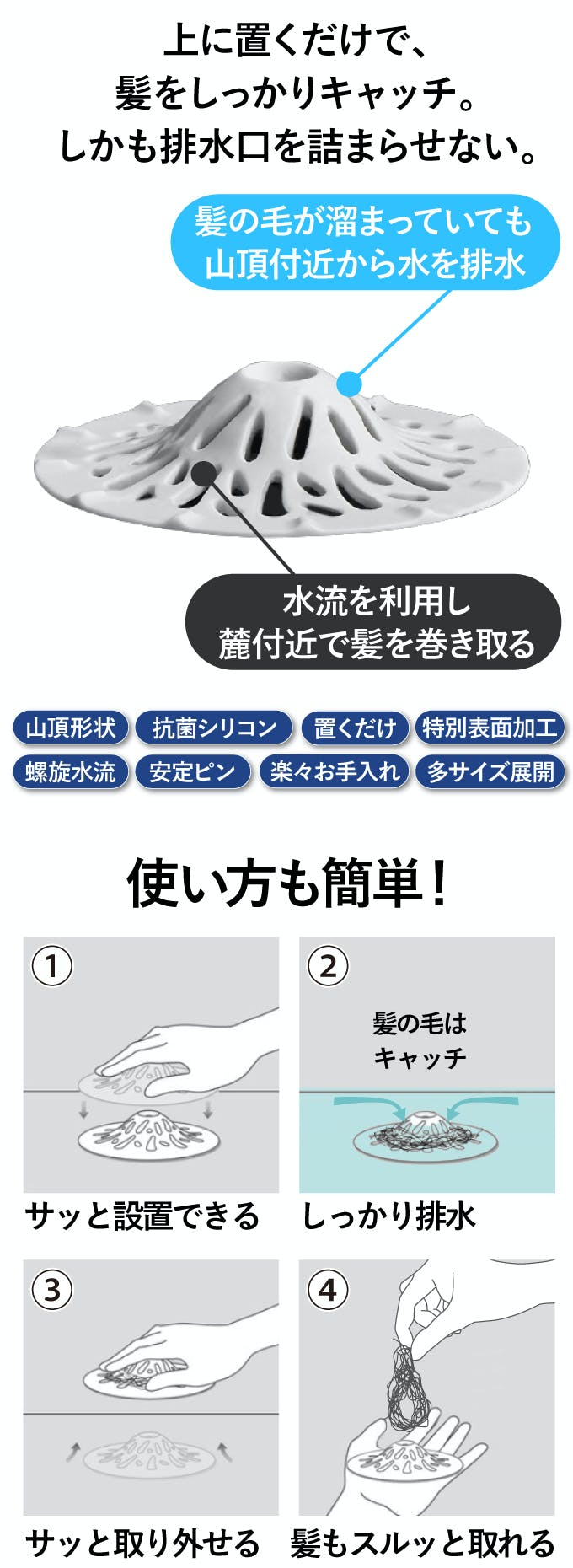 まるで雲海に囲まれた富士山のごとし。革新的な山頂型デザインは、髪の毛やゴミをしっかりキャッチしながら、しかし水の流れをせき止めることがありません。