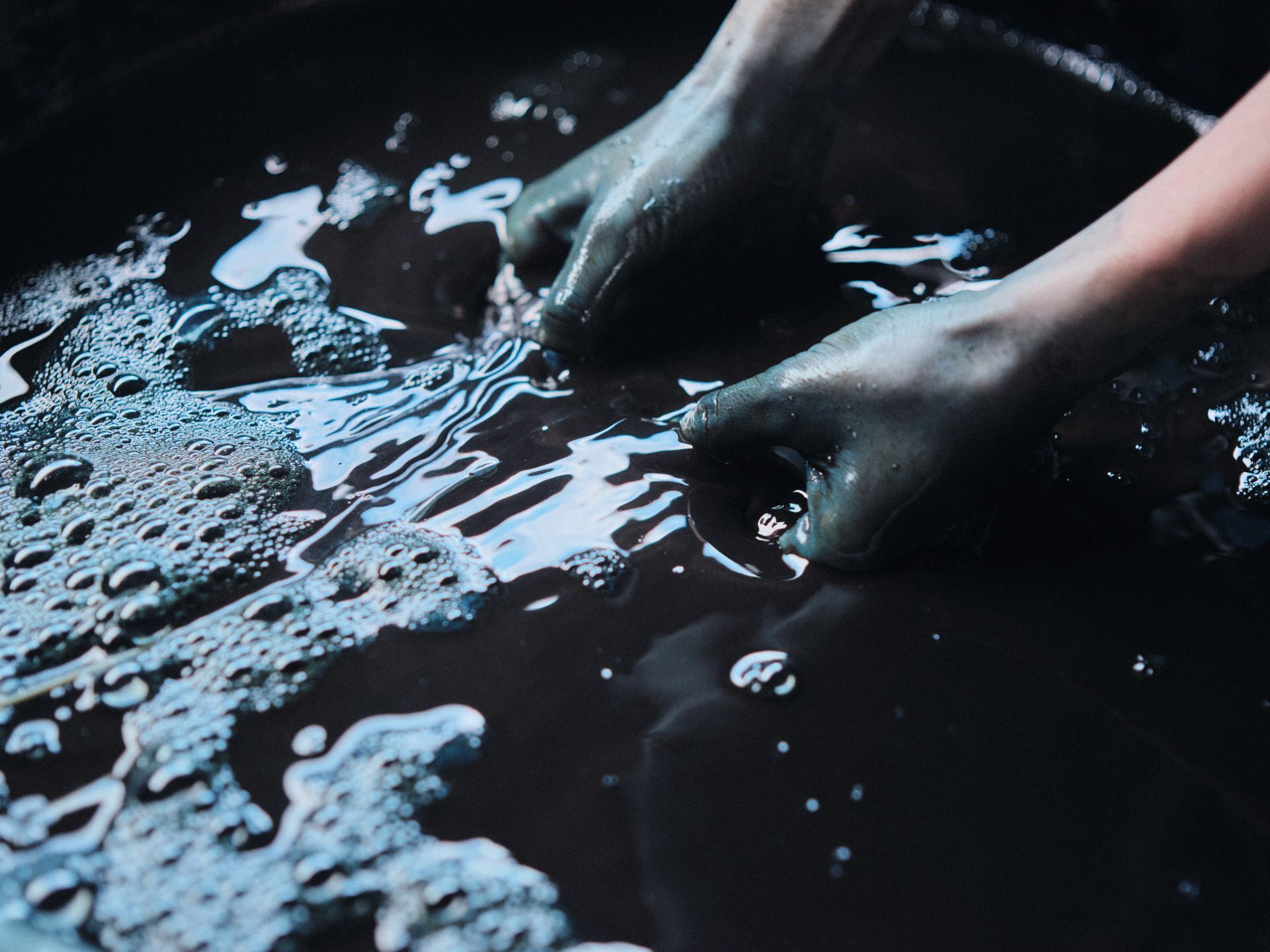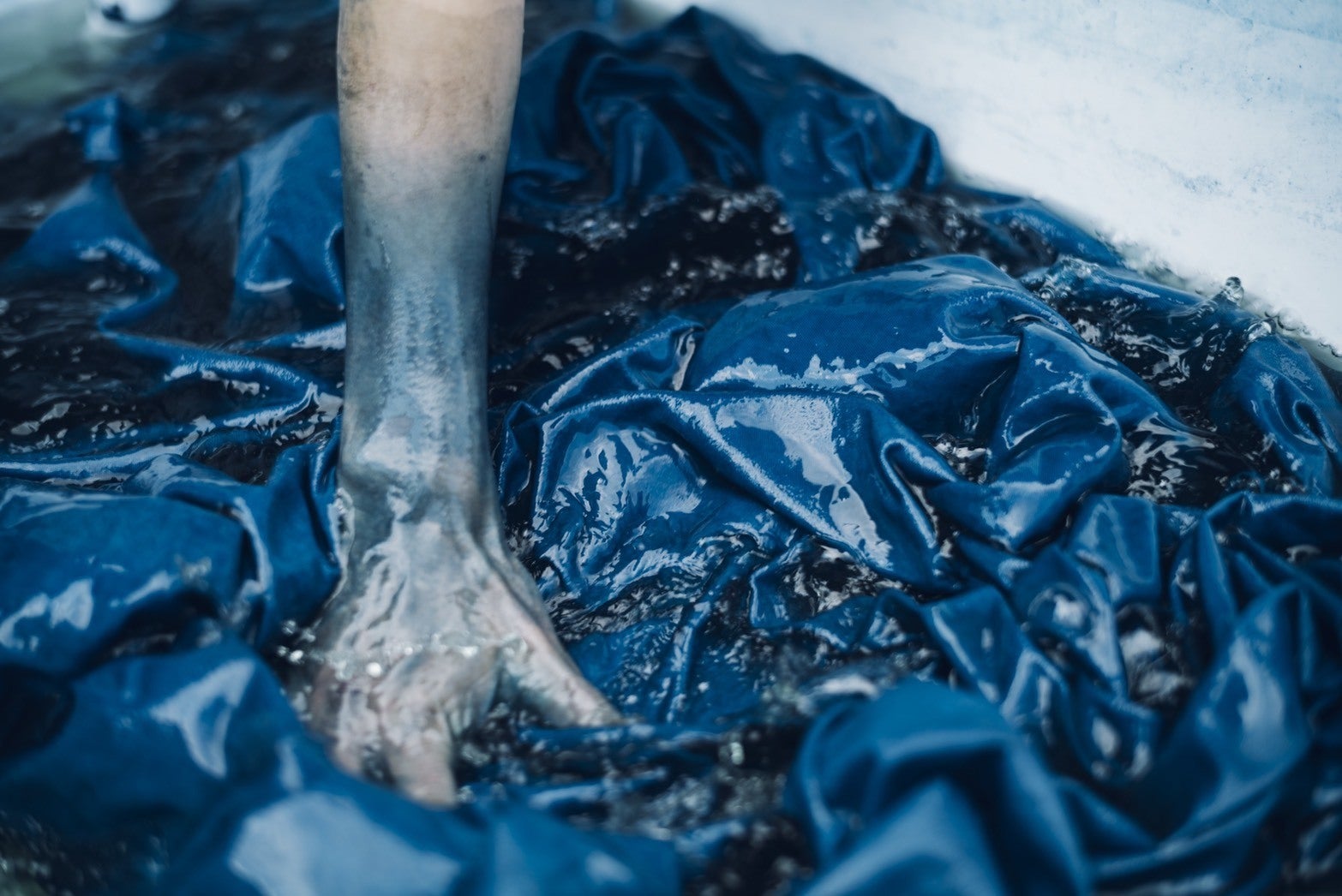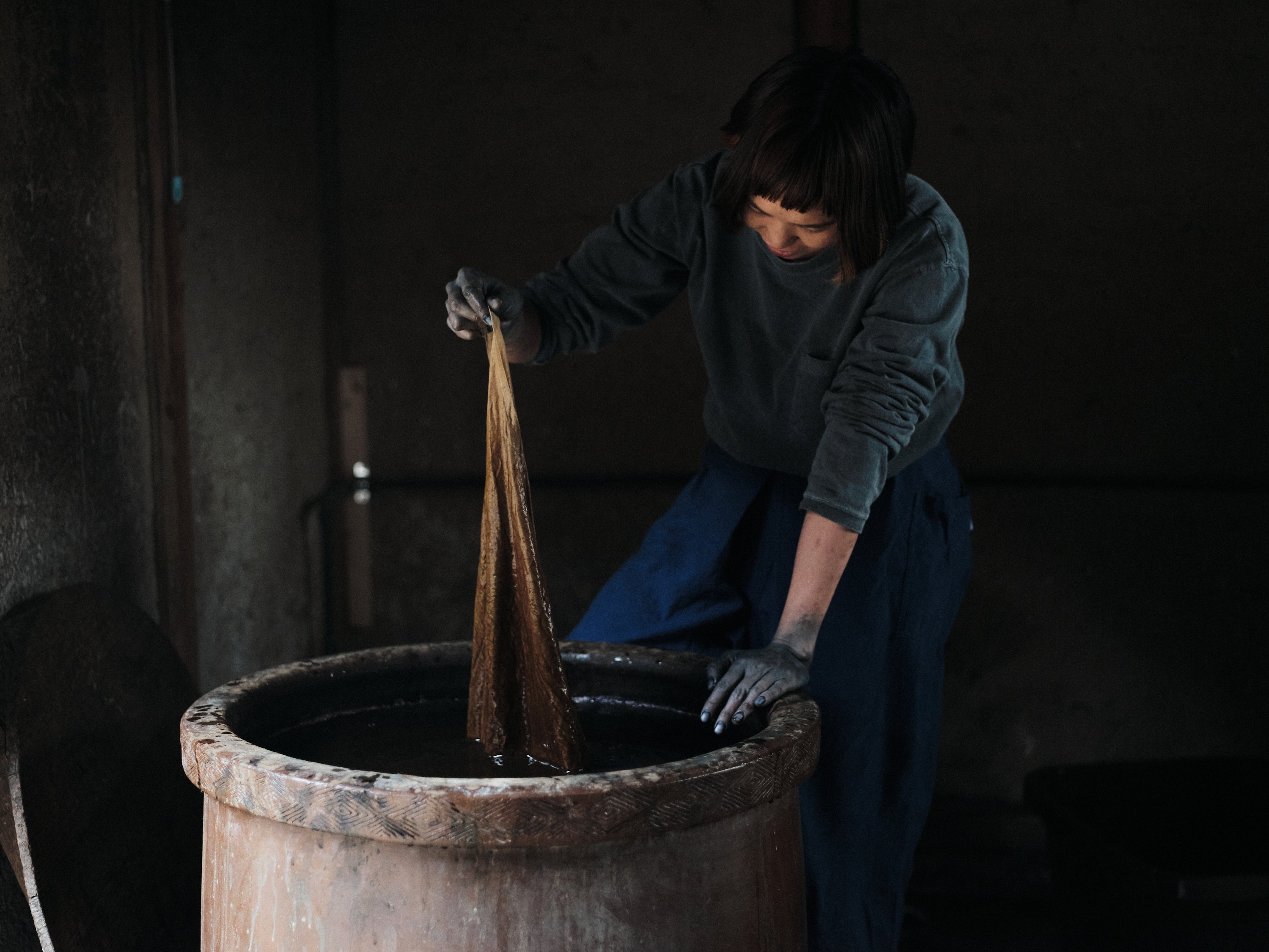 土地の気候や温度、水などにより、日々変動する藍の染液に合わせて染め方も日々変える。