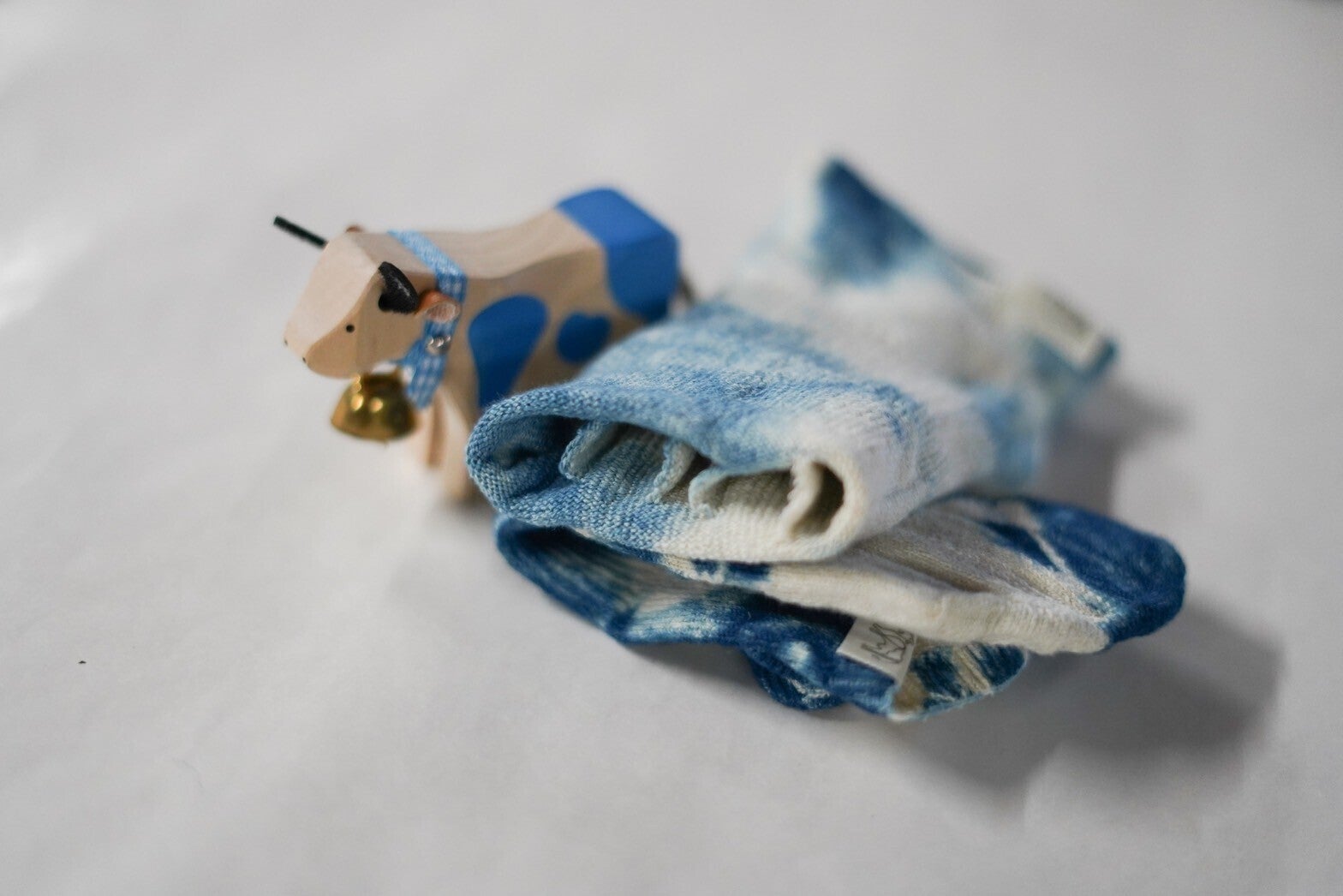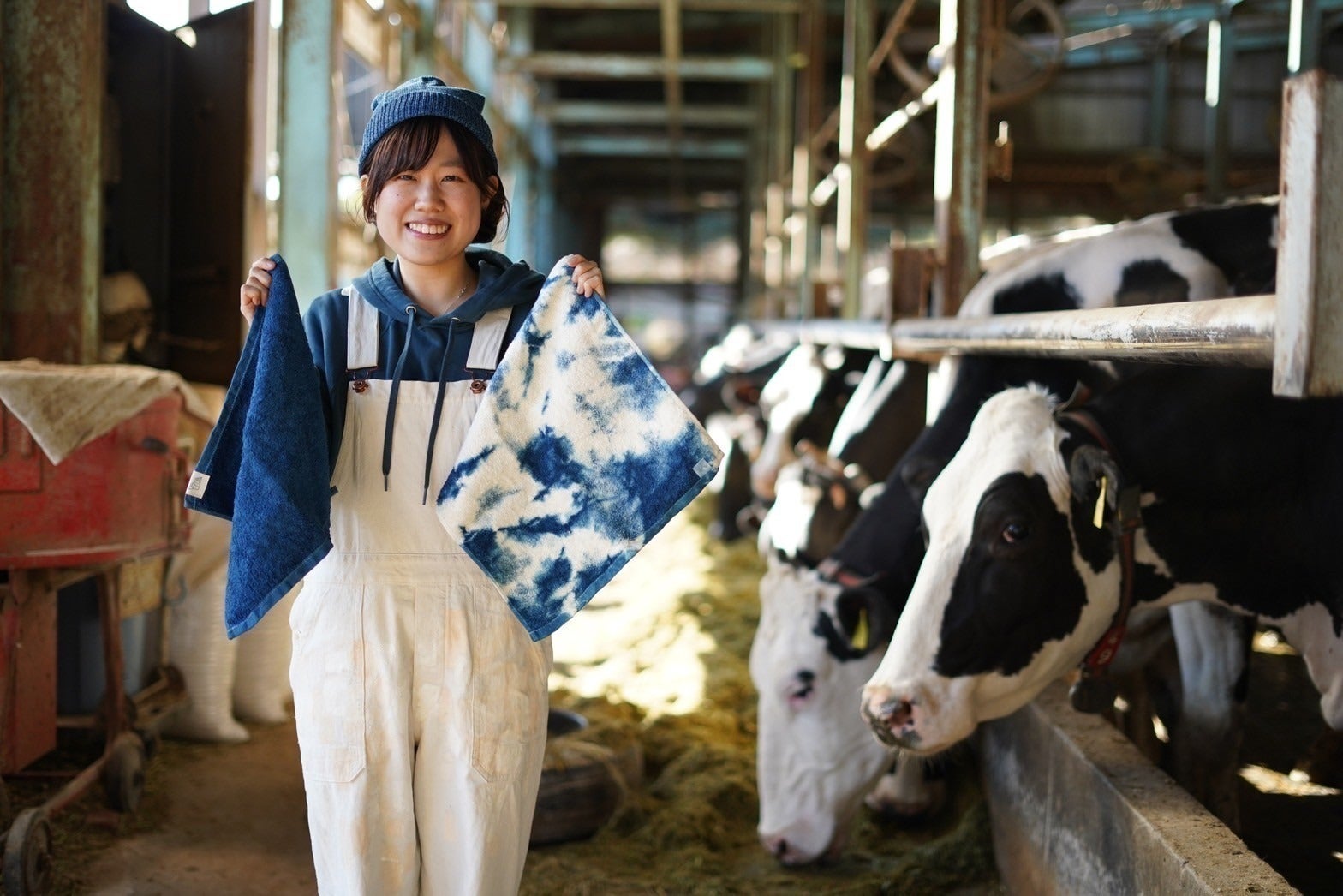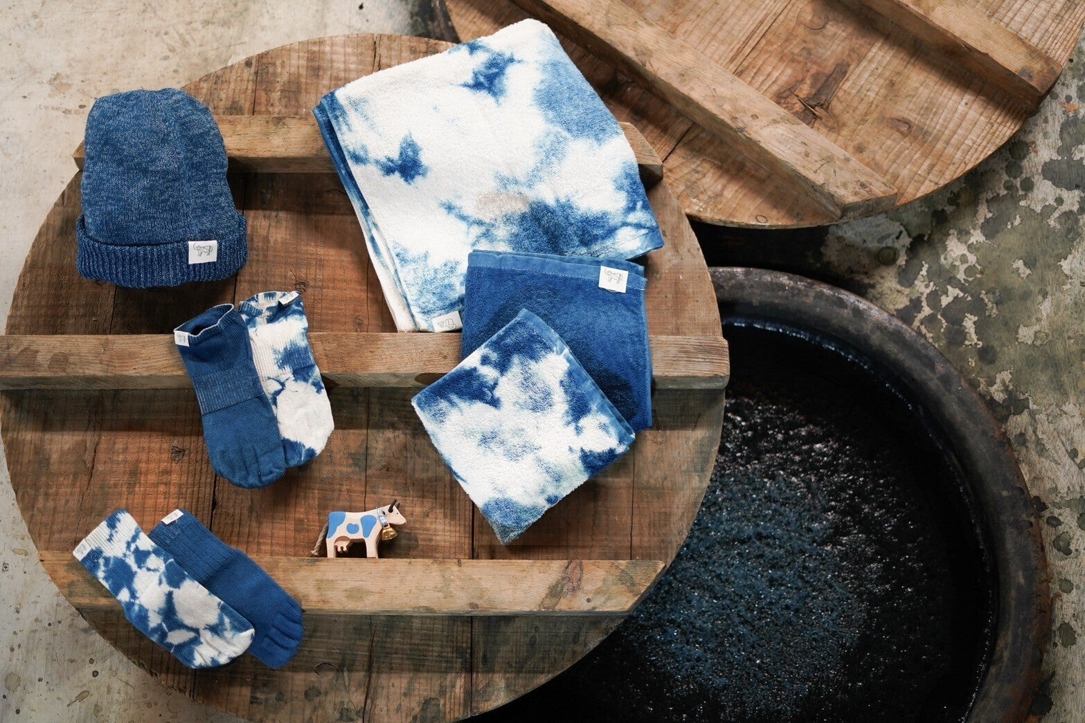 そうしてできた、牛乳パックからうまれた糸の、牛柄の藍染めの商品たち。