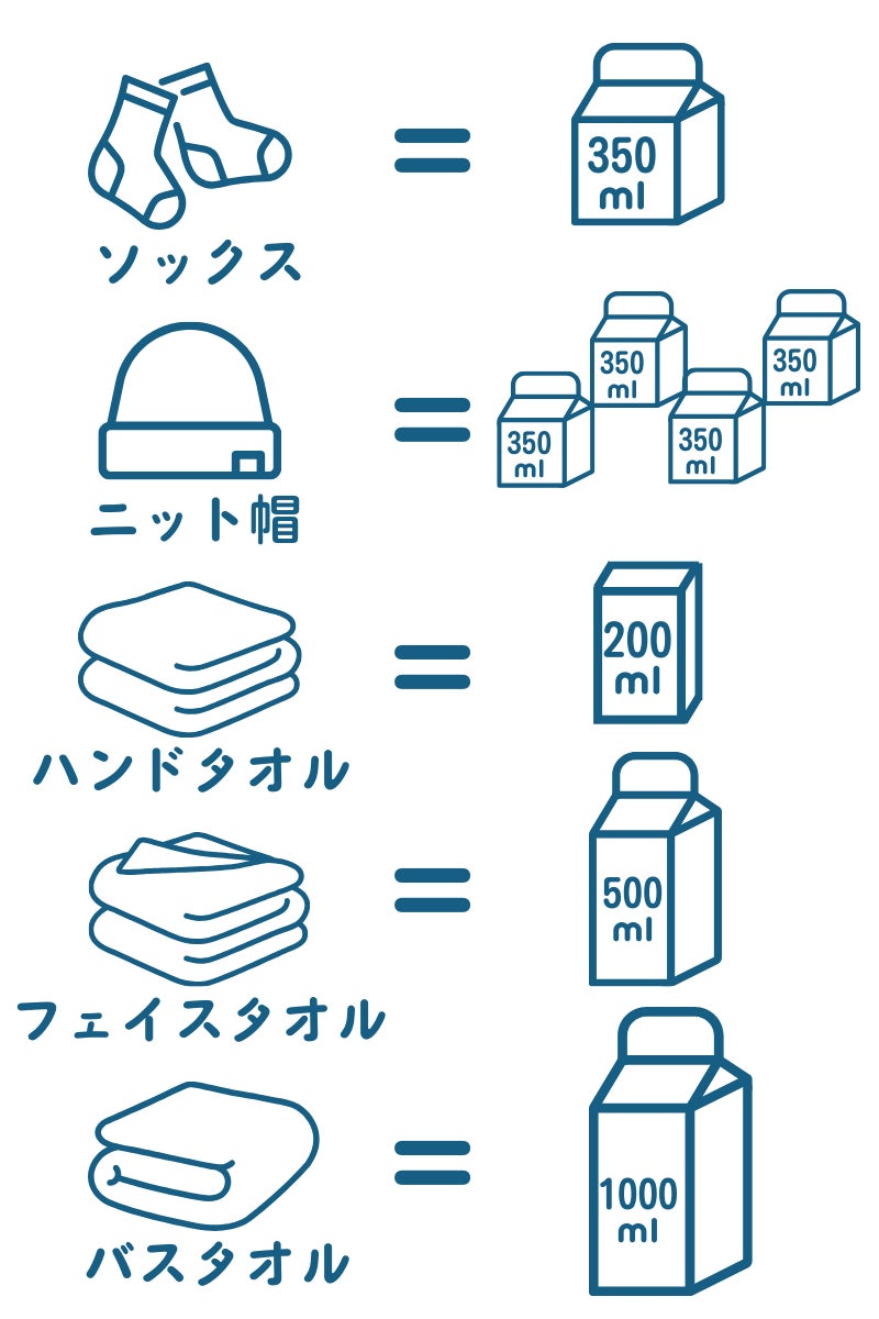 各アイテムは1アイテムごとに下記の量の牛乳パックを使用し削減につながります。