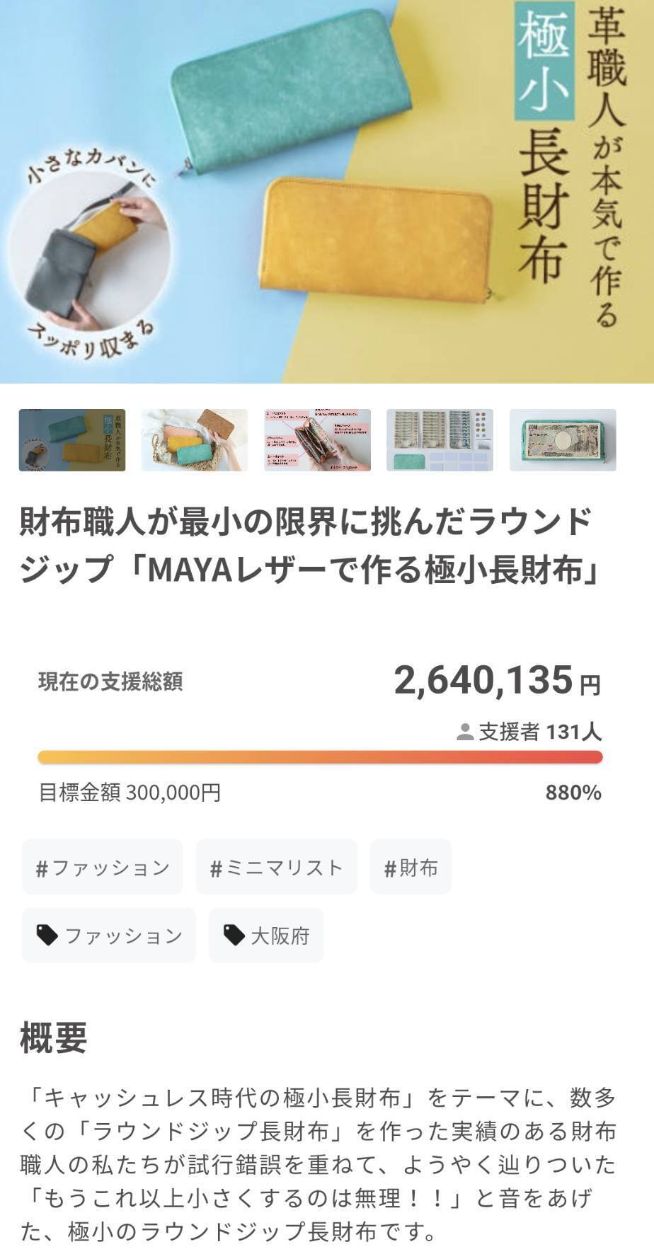 MAYAレザーで作る極小長財布は皆様のご支援のおかげで、当初の目標金額を大きく超え、目標金額880%を達成いたしました!本日より必要な革や資材を発注し、資材が到着次第、職人一同でMAYAレザーで作る極小長財布の製作に取り掛かります。発送は8月下旬から順次開始し、8月末までには全ての作品をお届けさせて頂く予定でございます!
