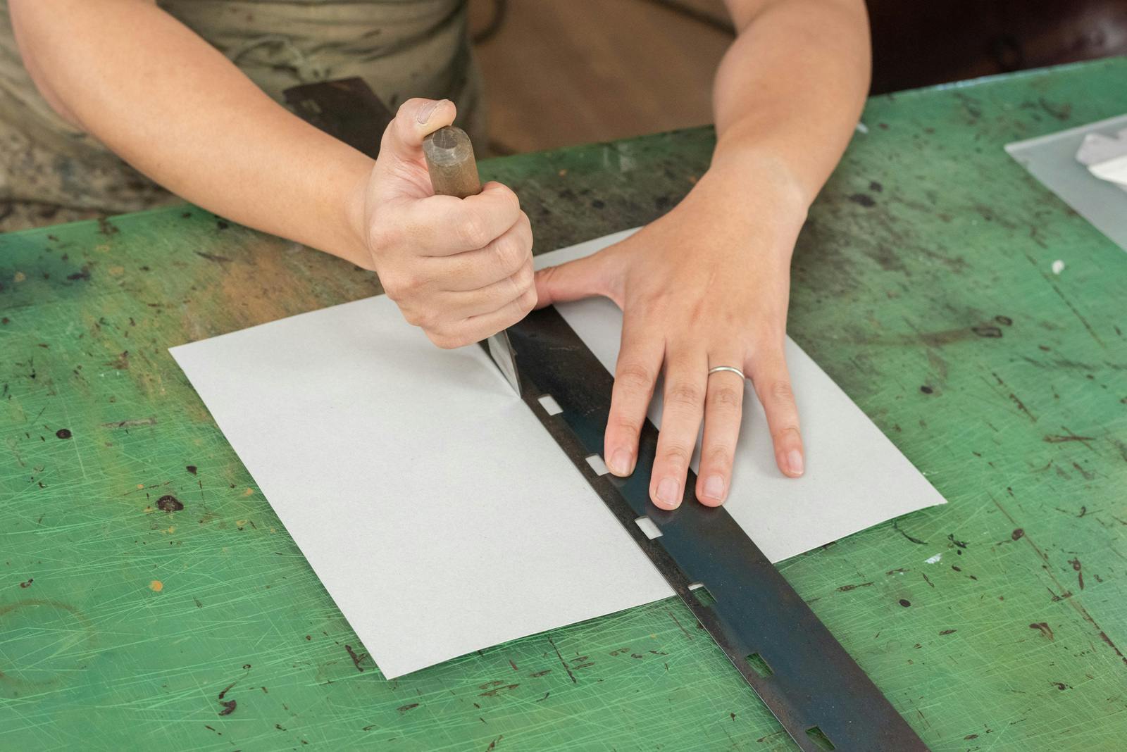 財布作りは緻密です。0.1mmでも貼り付けに誤差が出てしまうと、他の工程にも次々と歪みを生んでしまいます。全ての工程を寸分の狂いもなく作り上げることで、財布は完成します。
