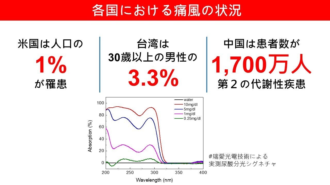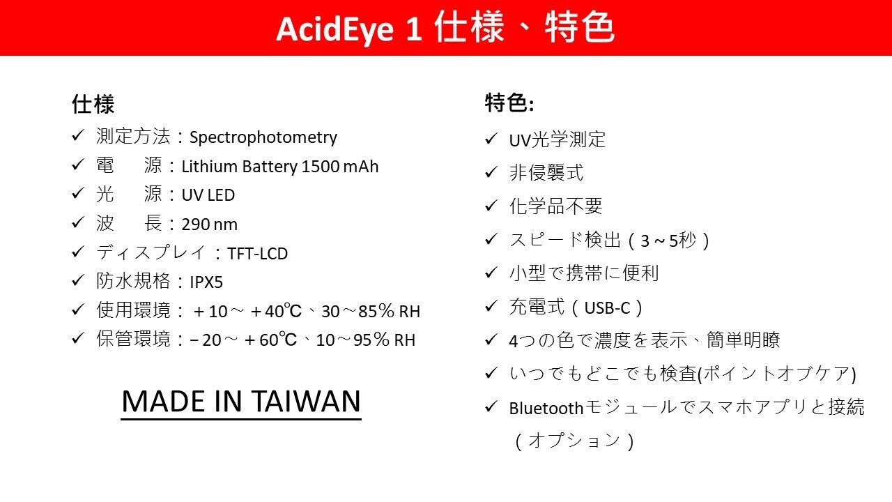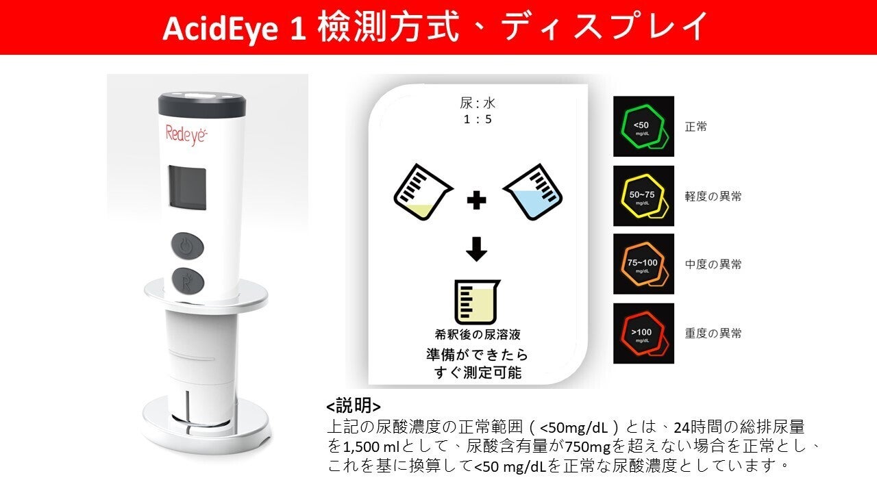 尿中尿酸センサー AcidEye1 アシッドアイワンは台湾RedEye社(瑞愛生醫社)が開発した尿の中に含まれる尿酸量を測れるセンサーです。測定原理は該社の得意とする光学技術で尿酸の光吸収量を測定することにより尿酸を検出します。