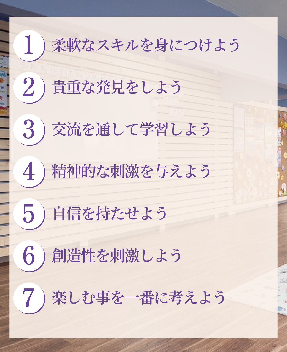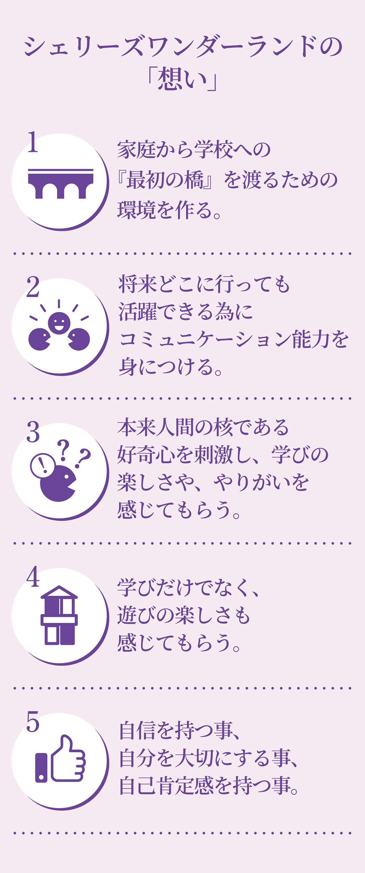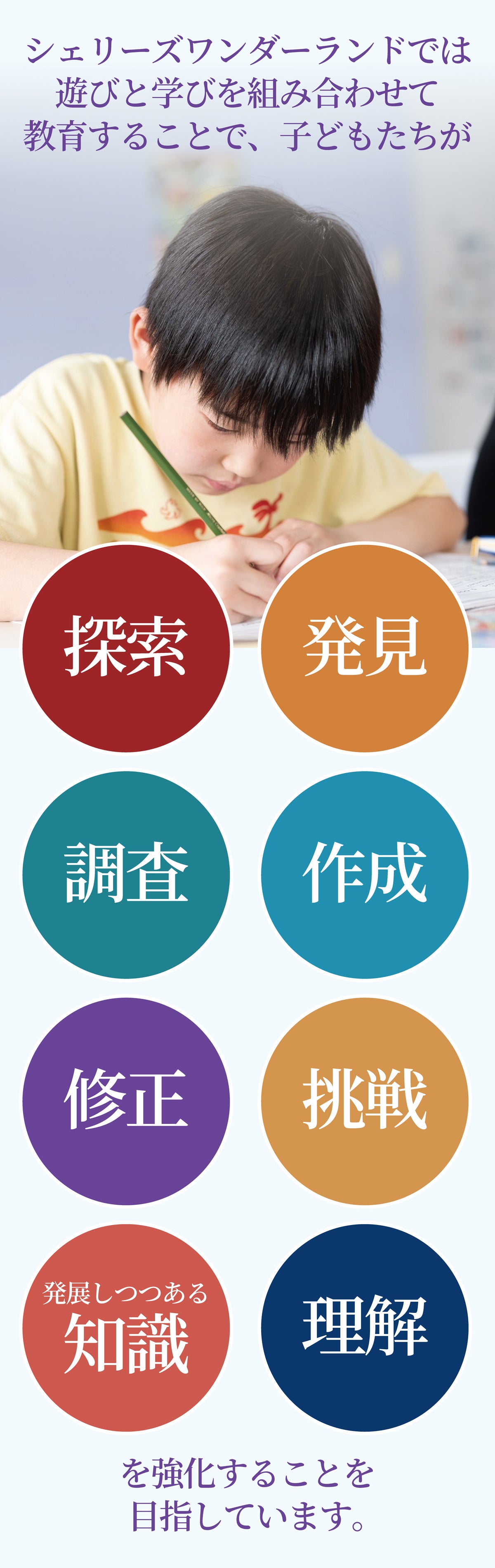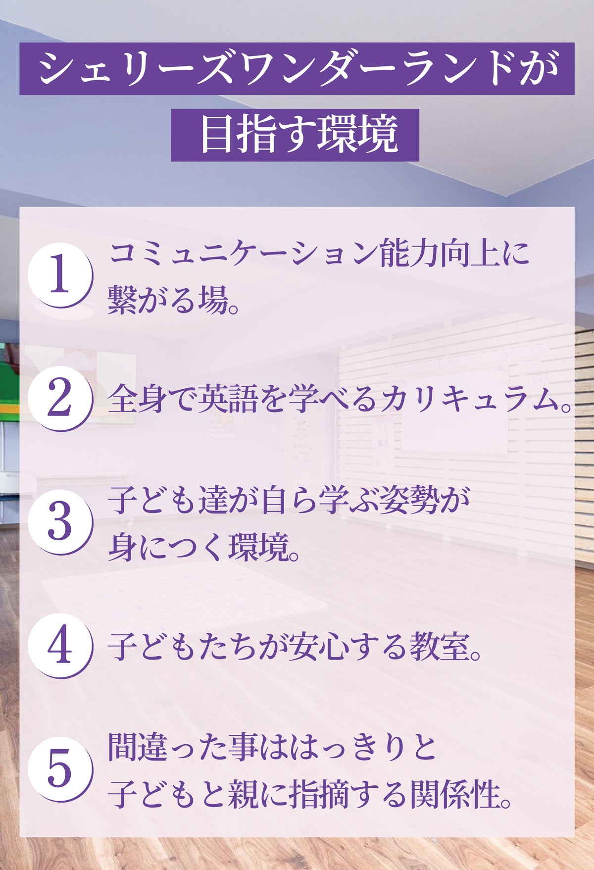 シェリーズワンダーランドの「想い」とともに、私たち自身が子ども達の成長を第一に考えて目指している「環境」は以下のようなもの。