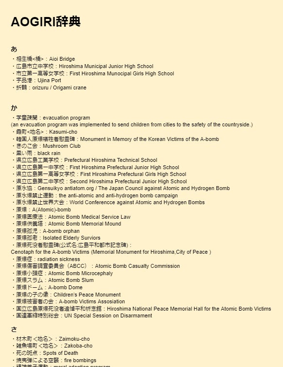 定期的に勉強会を開いたり、ペアで訳の確認をしたり、自分たちで原爆に関する辞書(通称、AOGIRI辞典)を作ったりもしました。