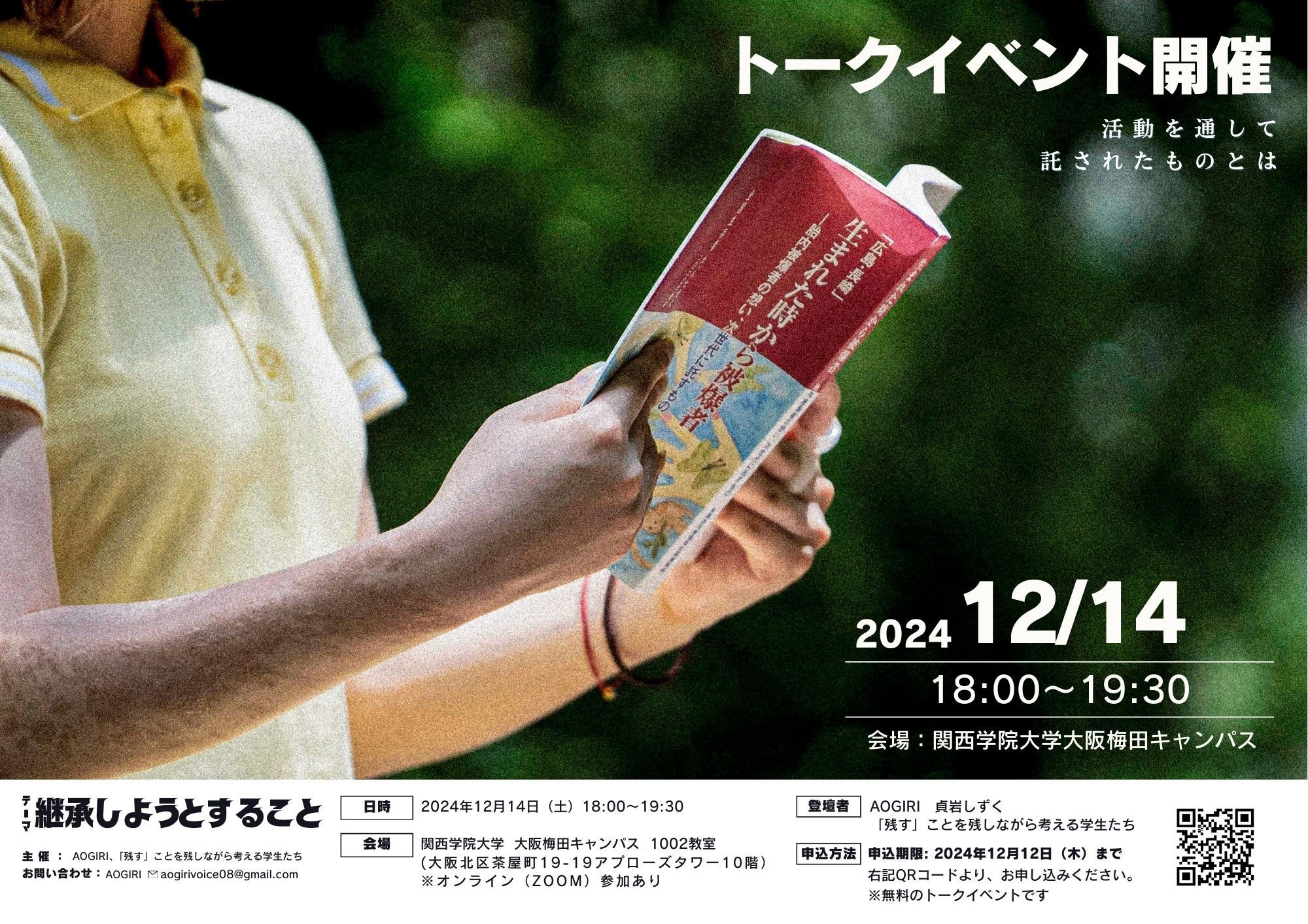2024/12/11 21:00直前のお知らせとなりましたが、トークイベントのお知らせです。今回は、被爆体験伝承者の想いをアーカイブとして残す活動をしている大学の後輩たちと一緒に開催します。トークテーマは、「継承しようとすること」です。「継承する」ことはもちろんですが、「継承しようとすること」に意味があると想い、活動を続けています。そんな私たちは、活動を通してたくさんのことを考え、学んできました。トークイベントでは、活動を通して学んできたこと、私たちだからこそできる「継承」についてお話しさせていただく予定です。ぜひご参加ください。【イベント詳細】トークテーマ:「継承しようとすること」日時:2024年 12月 14日 (土)18:00~19:30会場:関西学院大学 大阪梅田キャンパス 1002教室 (大阪北区茶屋町 19-19 アブローズタワー10階) *オンライン(ZOOM)参加あり登壇者:AOGIRI 貞岩しずく 「残す」ことを残しながら考える学生たち 石上千尋・中島弘貴・登川拓磨お申し込み:申し込み期限 2024年12月12日(木)まで https://forms.gle/npJUMwGdLxKmuvis8参加費:無料主催:AOGIRI、「残す」ことを残しながら考える学生たちお問い合わせ:AOGIRI ✉aogirivoice08@gmail.com もっと見る