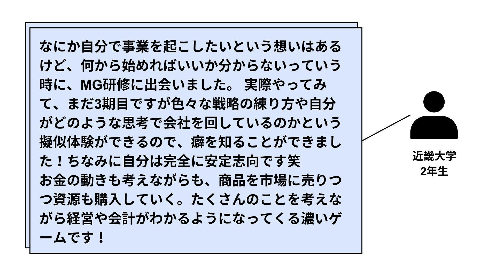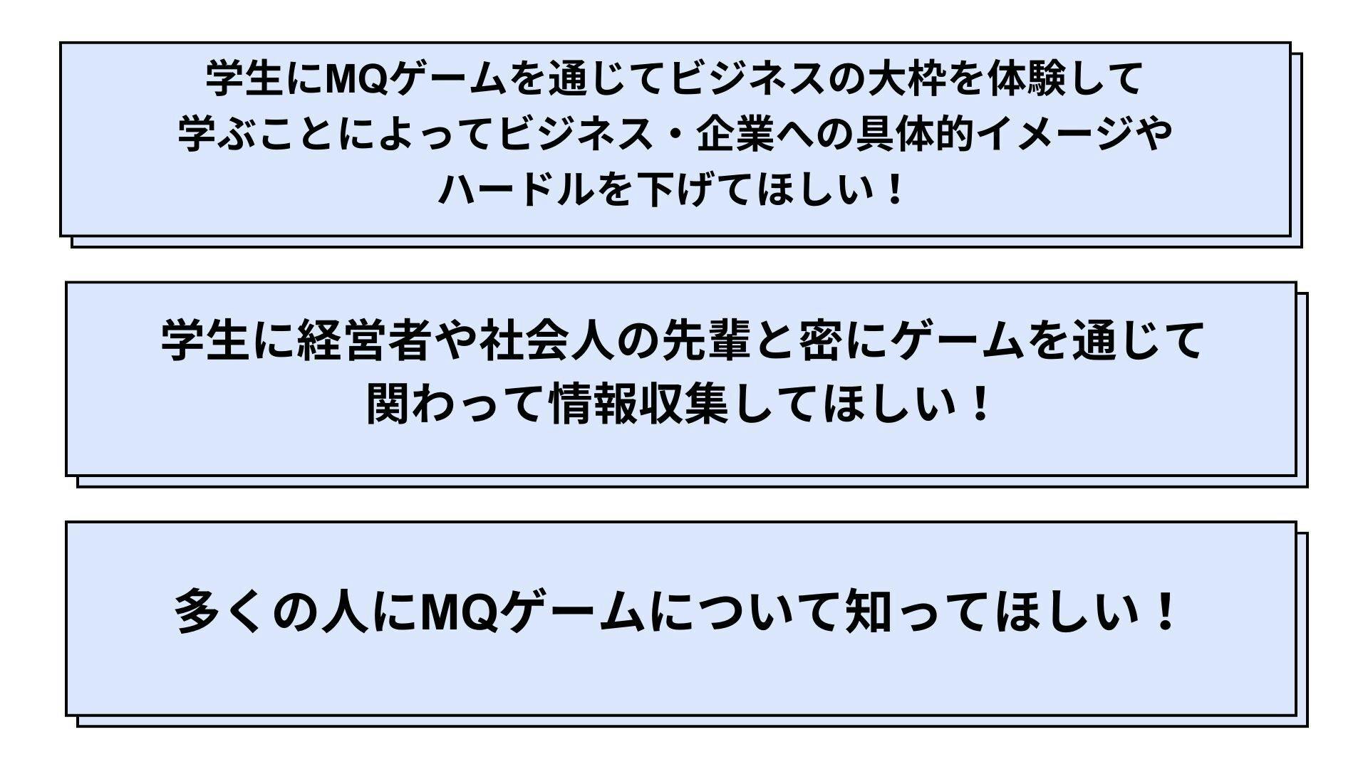 そんな時、MQゲームに出会い、このゲームを通じて経営者の方と学生をコネクトしたり、学生の「ビジネス」へのハードルを下げたいと強く感じました。