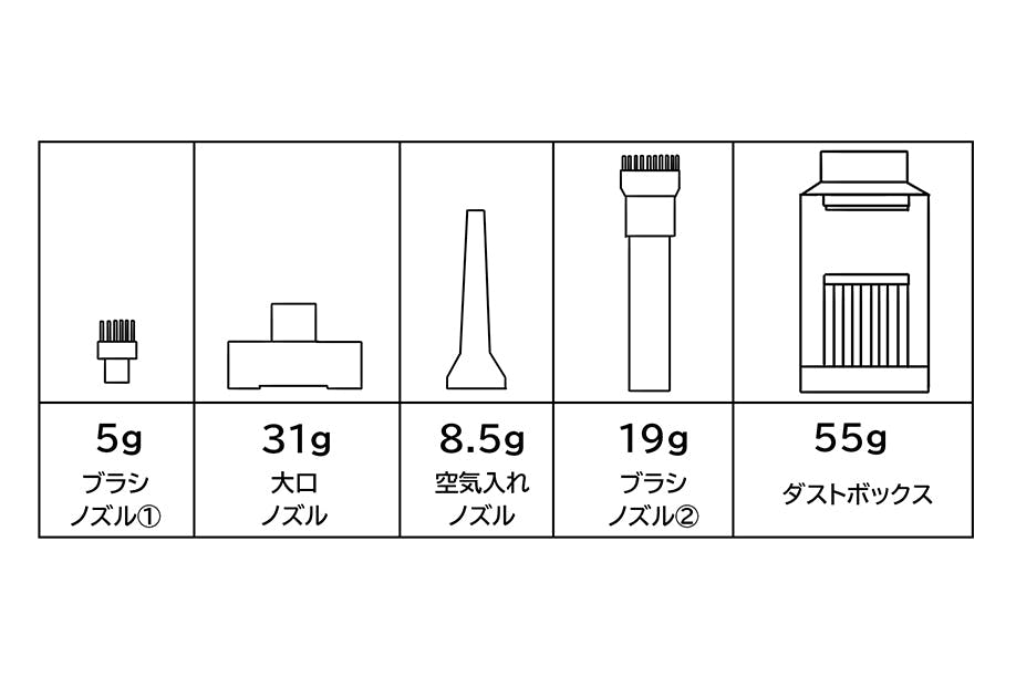 重量:290g(本体)、5g(ブラシノズル①)、19g(ブラシノズル②)、8.5g(空気入れノズル)、31g(大口ノズル)、55g(ダストボックス)