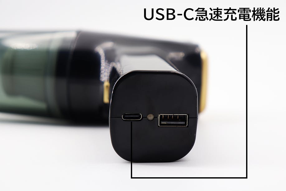 本体はUSB-C急速充電機能が搭載し、パソコンやモバイルバッテリーなどのUSB出力ポートから直接充電することができます。