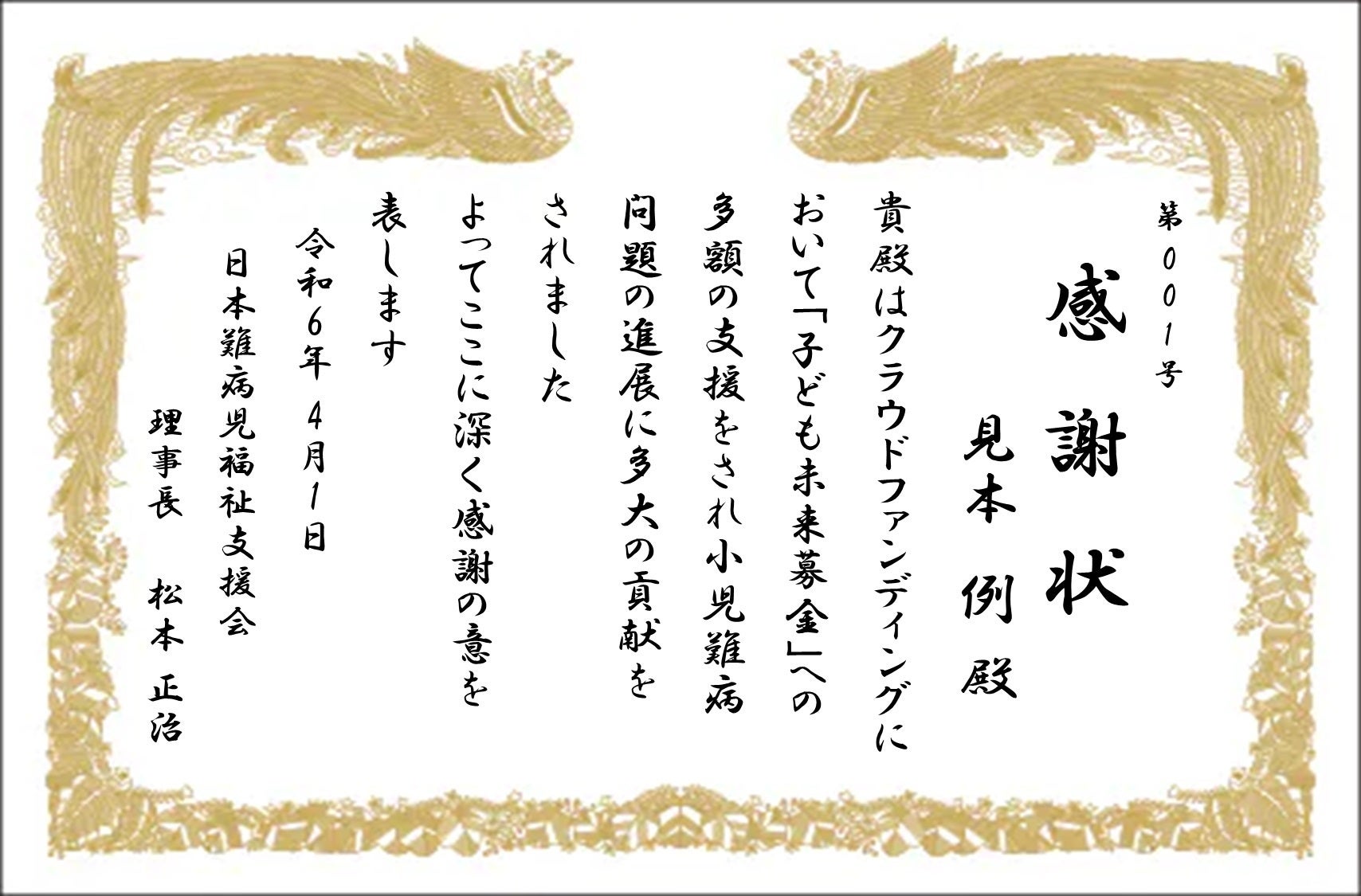 100,000円 企業者様向け 公式感謝状&ホームページへのメッセージ記載