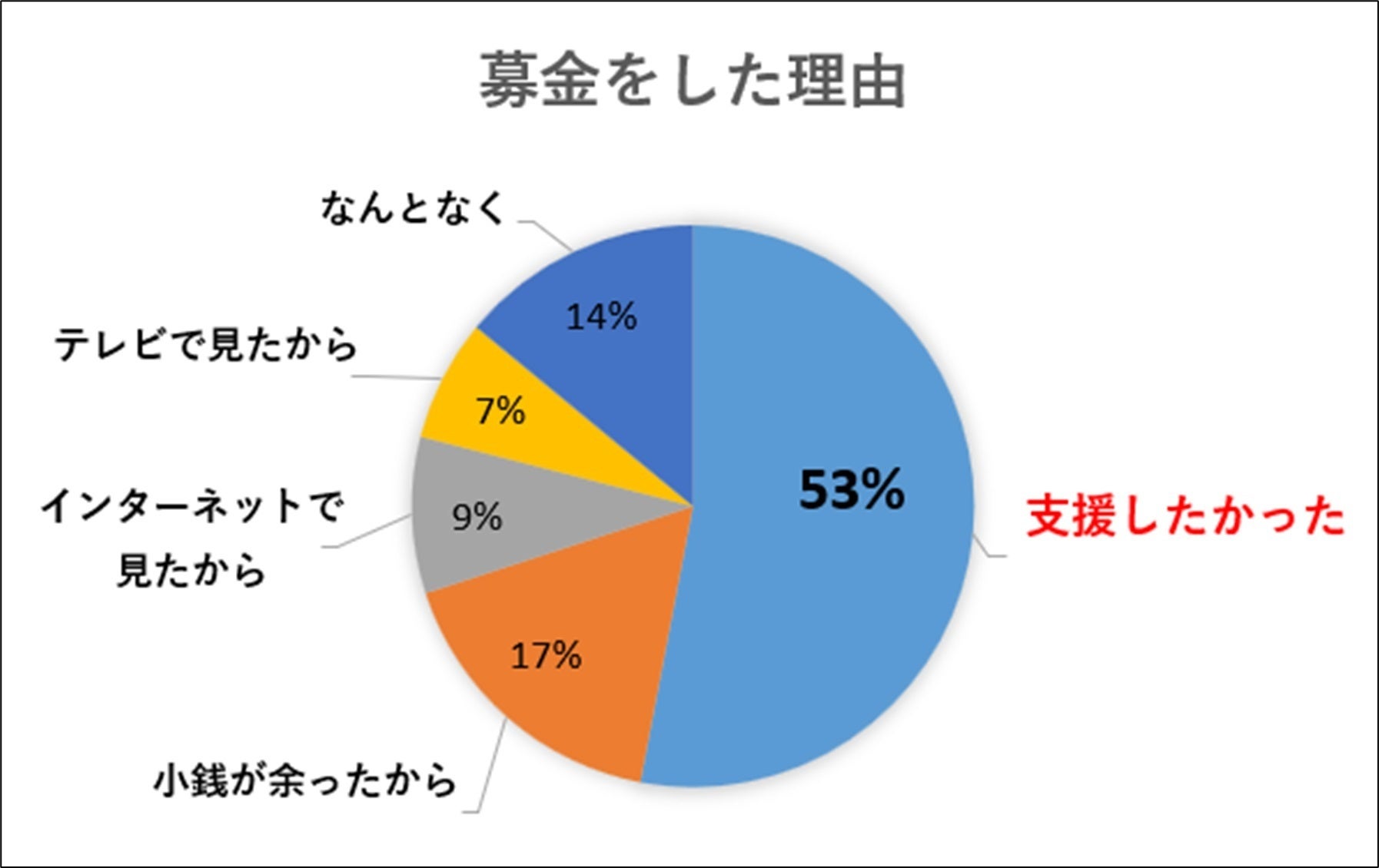 こちらで一番多い回答は素晴らしい事に「支援したかったから」が53%と最多でした。