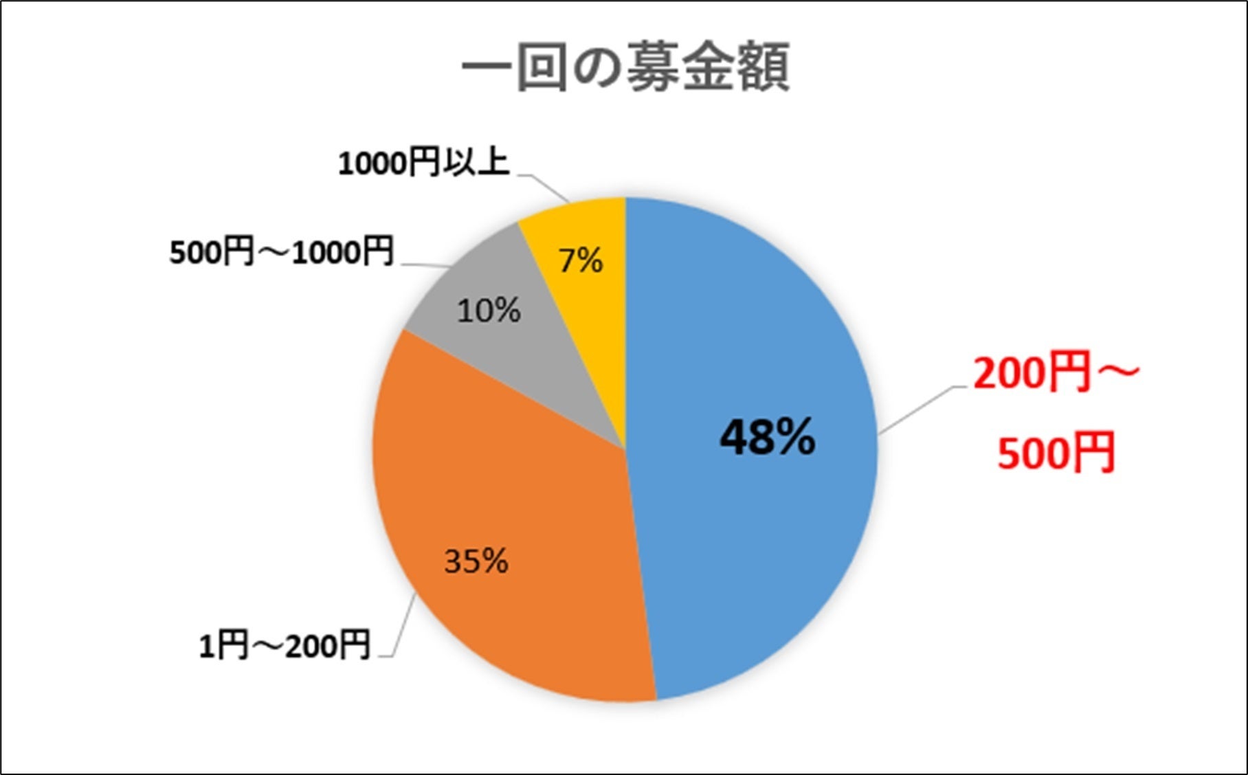 こちらも先ほどの回答と同じく1円~500円の募金額が全体の83%を占めています。