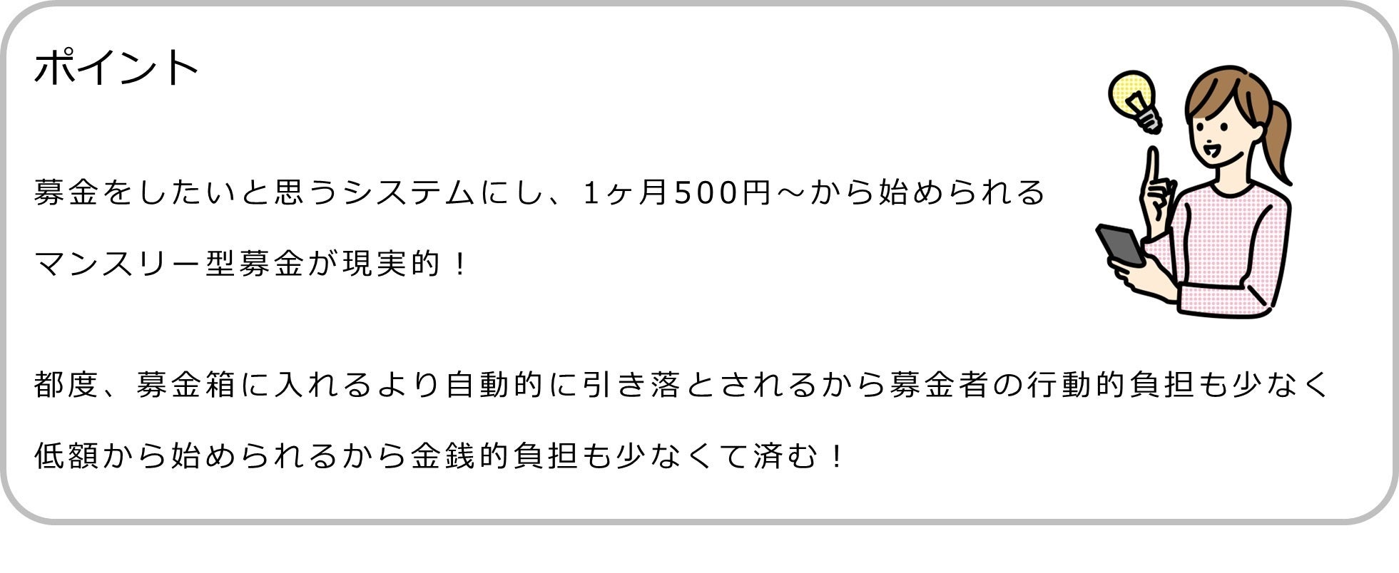 マンスリー型の募金にすることで気兼ねなくできるようになるのです。