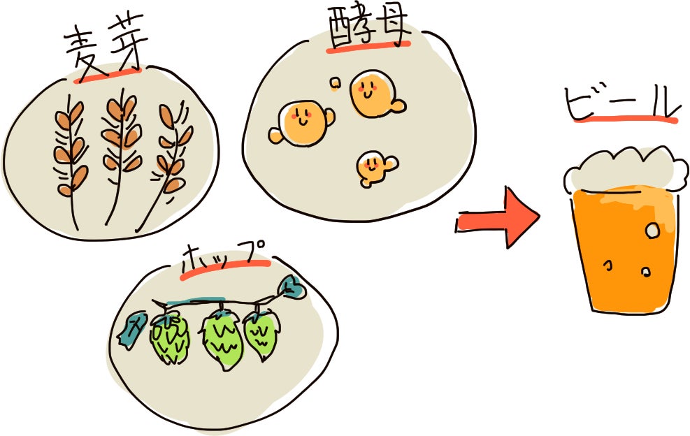 ビールは主に麦芽、ホップ、酵母から出来ています。