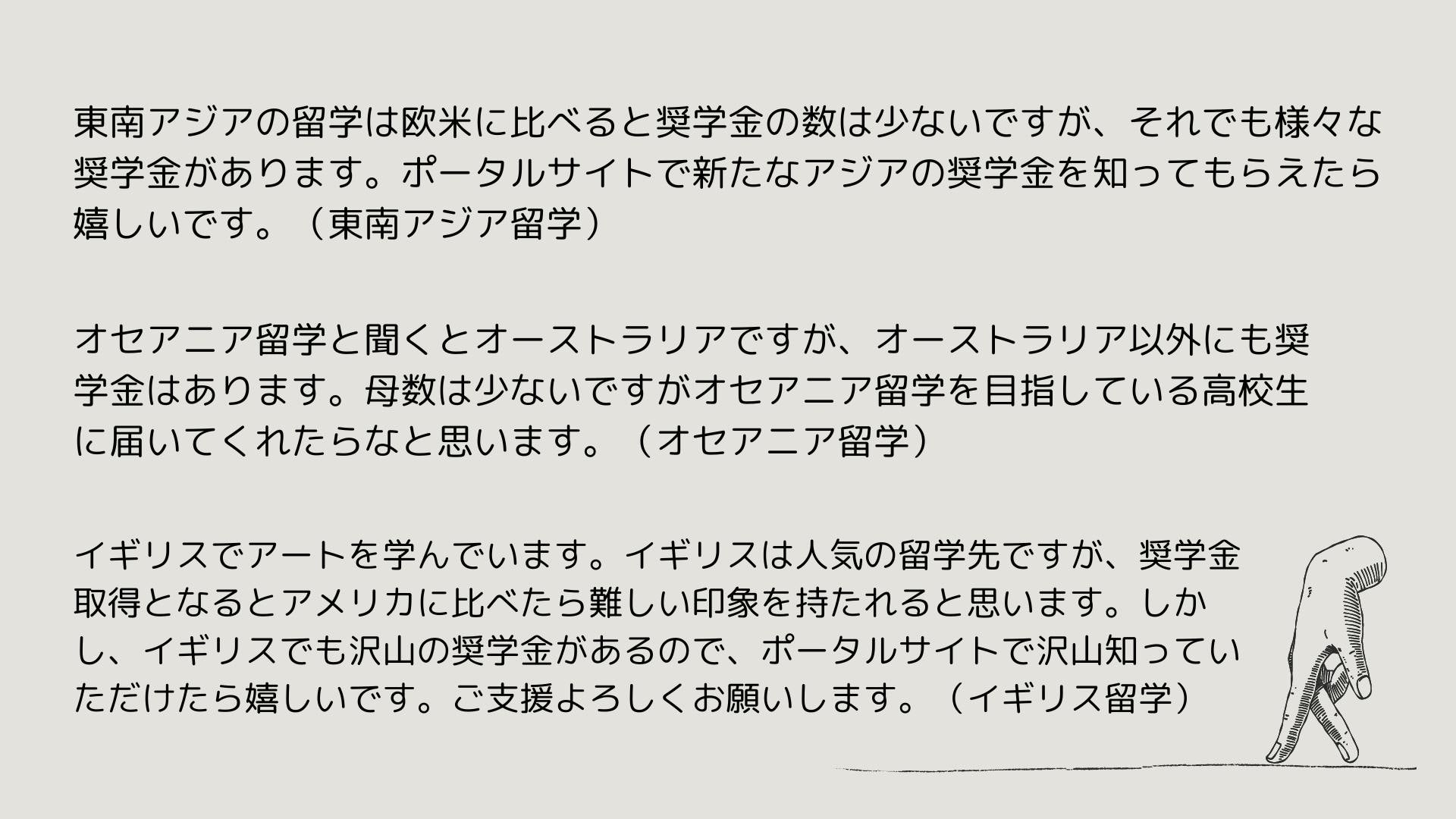 私たちメンバー24人は総勢500以上の大学奨学金と30以上の国・民間の奨学金情報を持っています。これらの情報は将来留学を希望する方にとって力強い支援となると私たちは思っています。教育は平等に与え、情報格差は是正されるものです。これらの情報を初めて得た方たちにとって、将来の夢や希望への第一歩となります。私たちは内に秘めることなく、これらの奨学金情報を積極的に発信することで、学生たちの可能性を広げ、教育の質を向上させる一助となることを信じています。