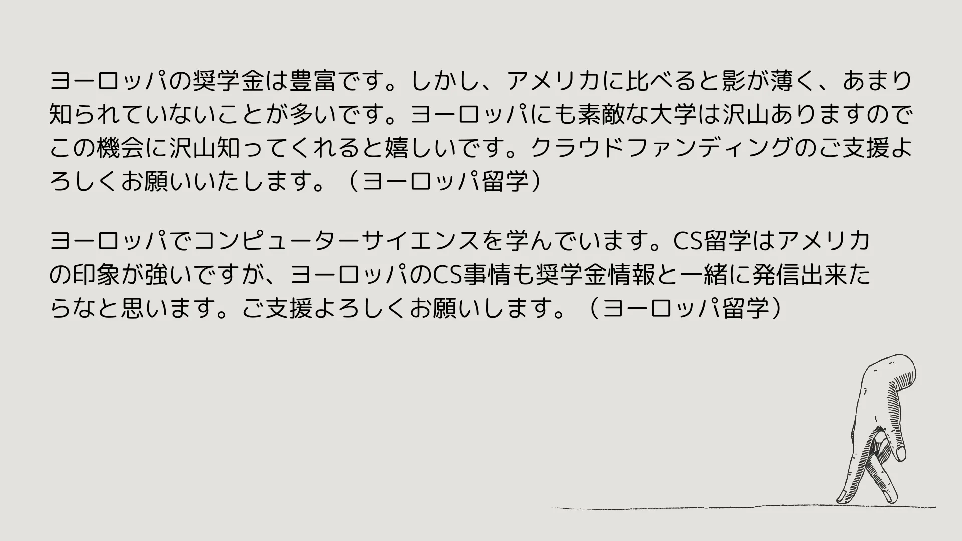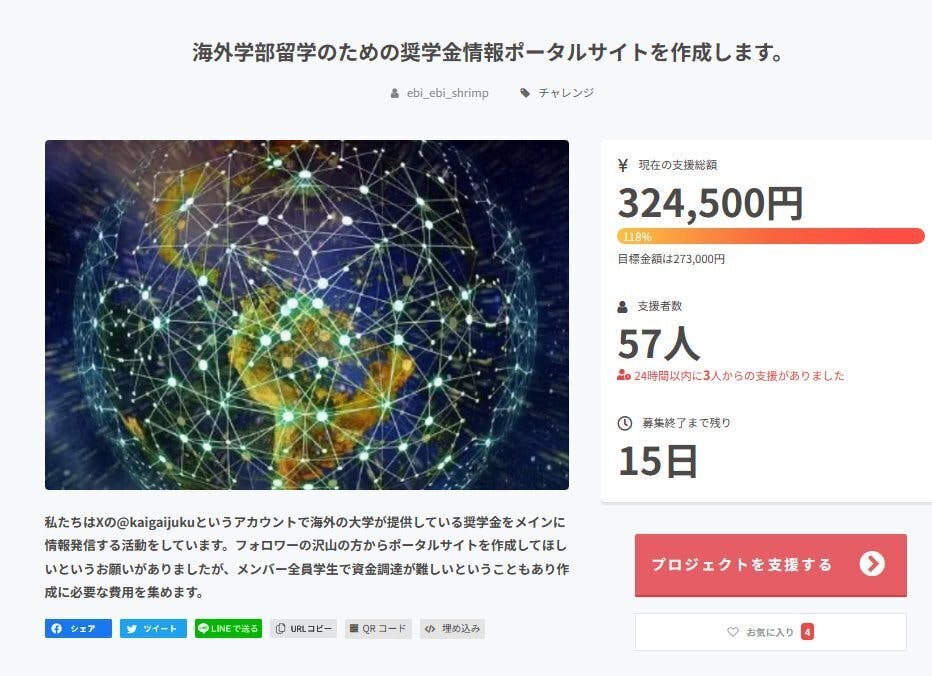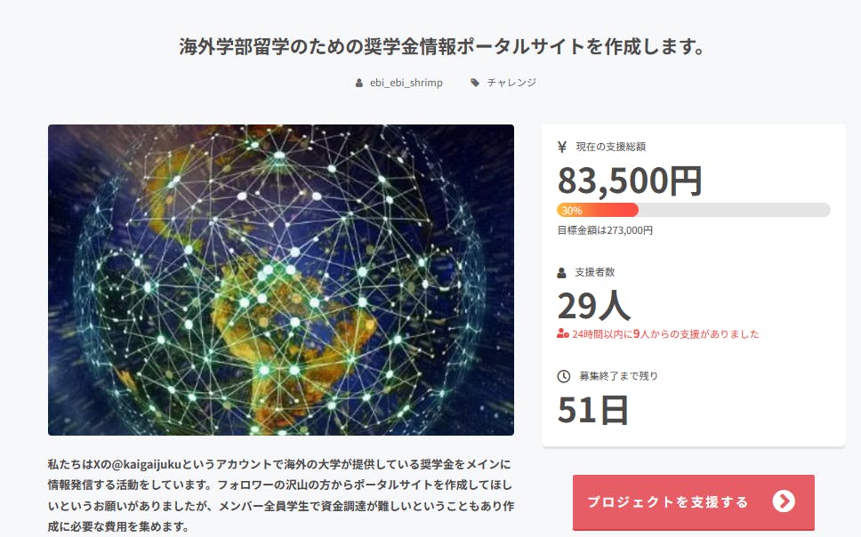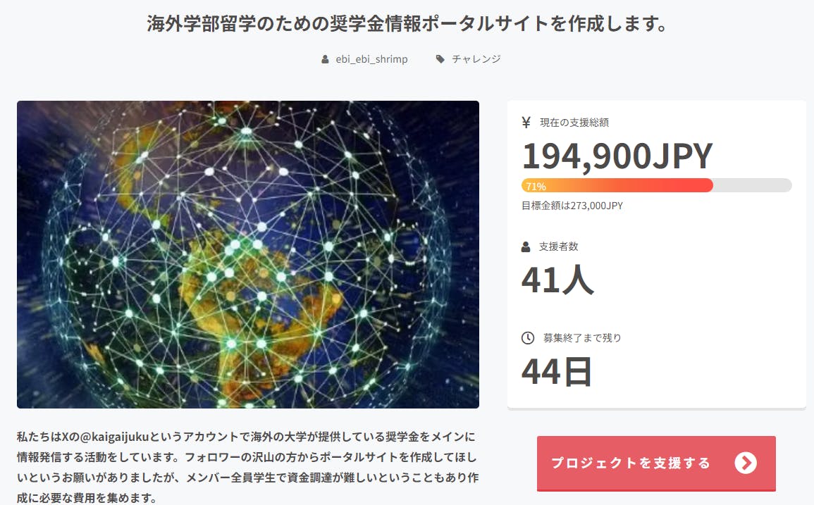 ツイッター海外進学塾は海外の学部留学、編入学を希望している方向けに大学から支給される奨学金の情報を発信しているグループです。X(旧Twitter)の沢山のフォロワーさんからポータルサイトを作成してほしいというお願いがありましたが、メンバー全員学生で私たちからの資金調達が難しいということもあり作成に必要な費用を集めるためにクラウドファンディングを始めることにしました。