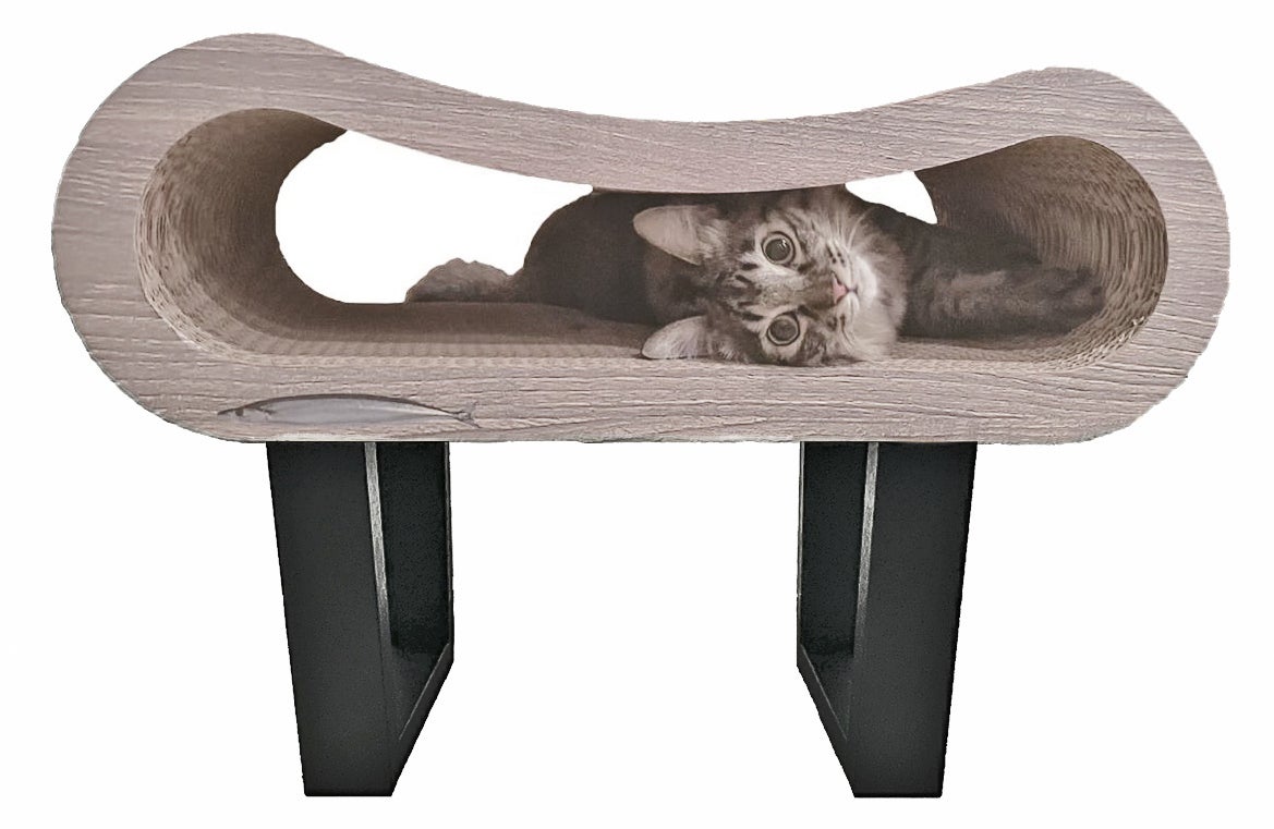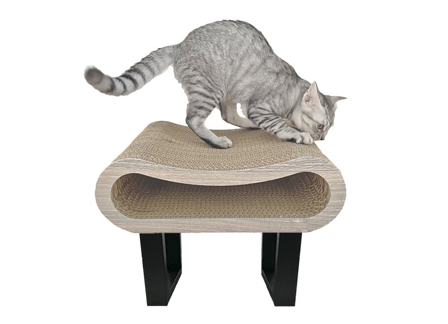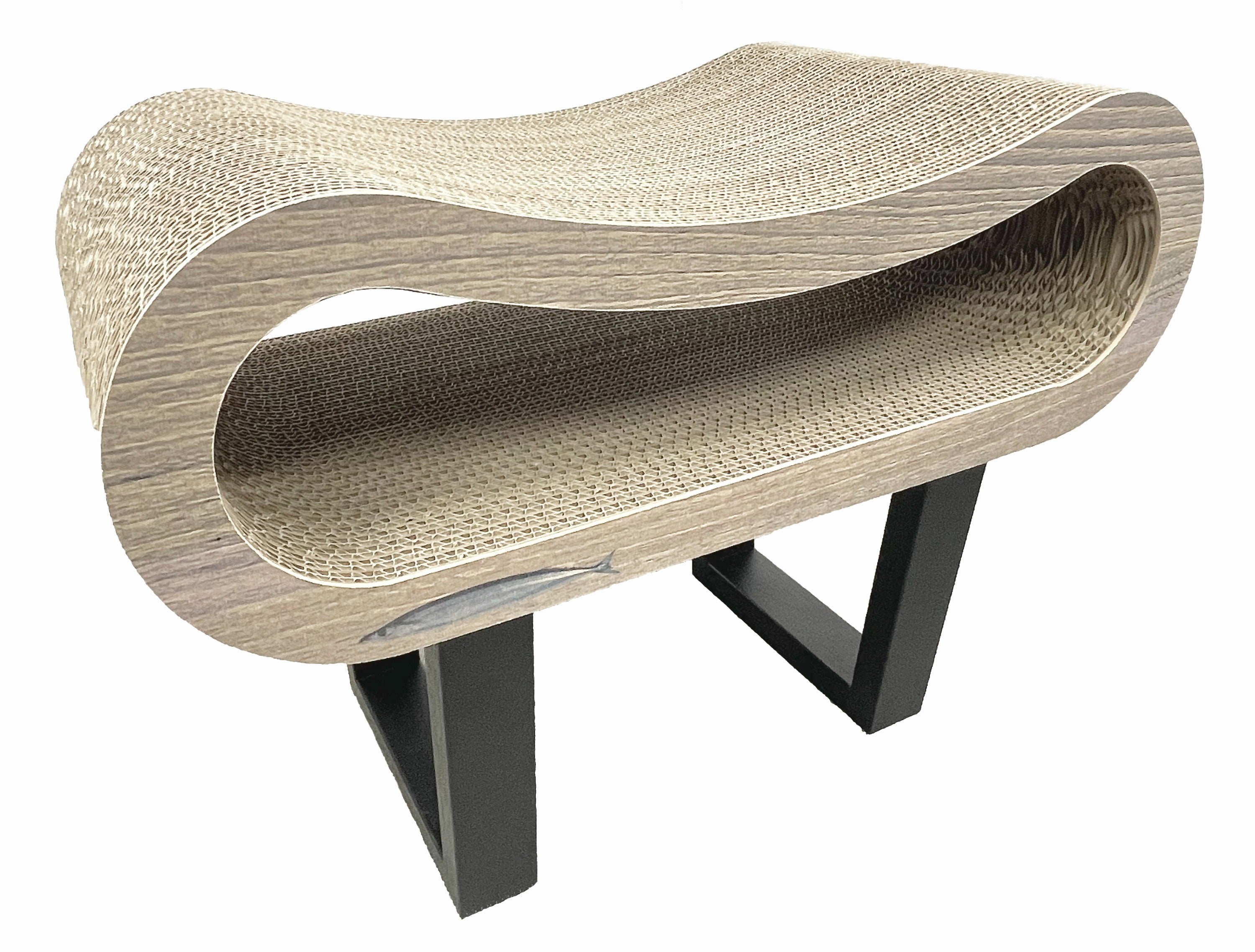 製品の誕生は猫様との目線の違いから生まれました。家族の一員でありながら、いつも床に近い部分で爪とぎをしていて、爪とぎの上でくつろいでいる状況です。飼い主は上から、ネコちゃんは下から見上げる格好となり、より近い目線で接してあげたい。そしてオシャレでモダンな家具の様な爪とぎやベッドがあってもいいのではないかとプロジェクトを立上げいたしました。人が座れるほどの強度を保有し安全面を強化しています。脚の部分のオークウッドはしっかりした軽すぎない重みもあり、猫様にとって安定してくつろげる環境を提供したいという思いで設計されました。
