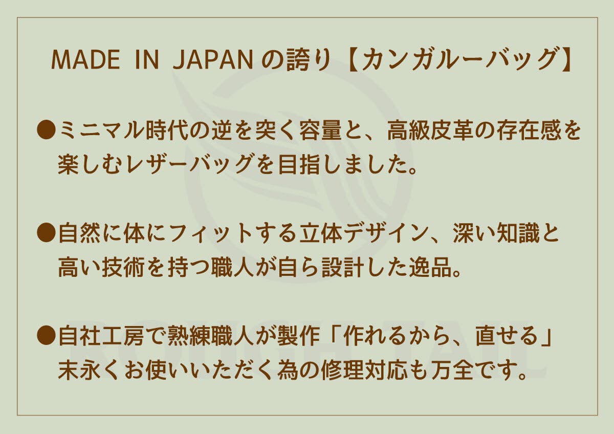【カンガルーバッグ】はコンパクトに収納するミニマル時代の逆を突く容量とデザイン、そして高級皮革を使い国内自社工房にて熟練の職人が「一点、一点」魂を込めて製作しました。