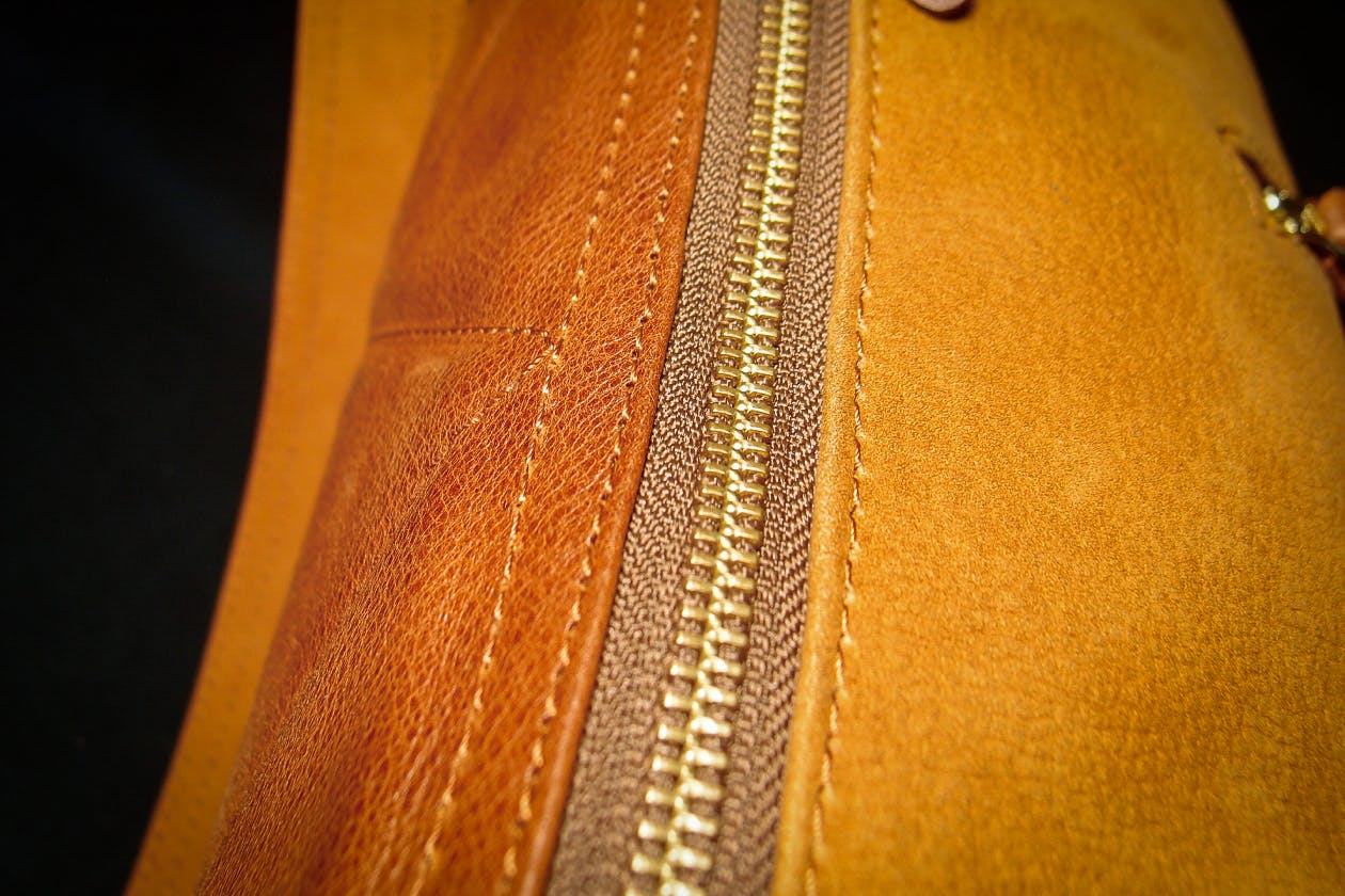 一見一枚革のようですが「セザール」と「ジェフウォール」を張り合わせて製作しました。カンガルーポケットの引手にも採用しています。