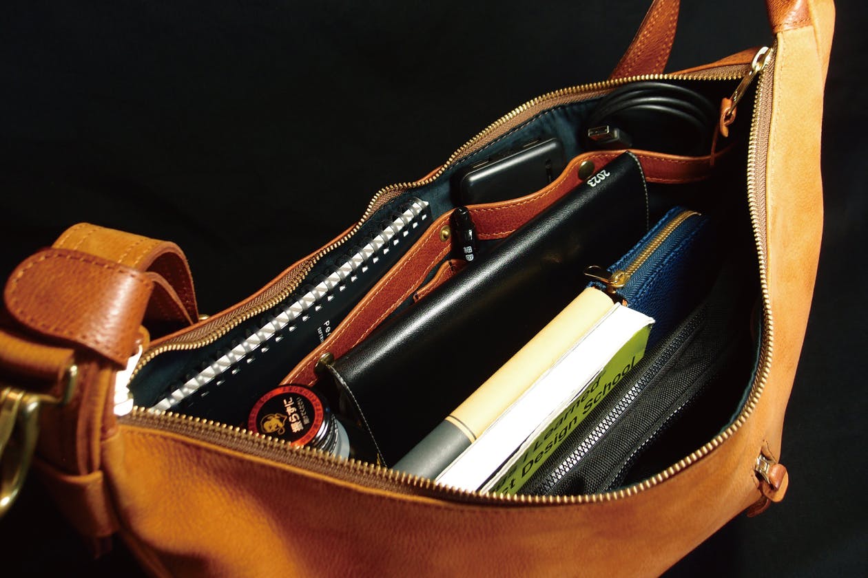 イメージしたのは大人の男性が持ち歩く少しゆとりのあるサイズ、そして質感が高く収納物を整理しやすいボディバッグ。