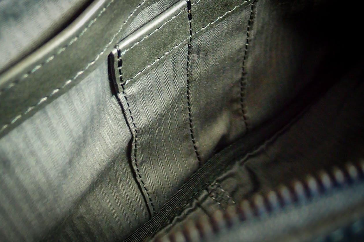バッグの顔といえる正面には、起毛ならではの手触りと艶消しが魅力の「セザール」。そして背面や内ポケットの部材は、硬めでサラリとした手触りの「ジェフウォール」で製作しました。