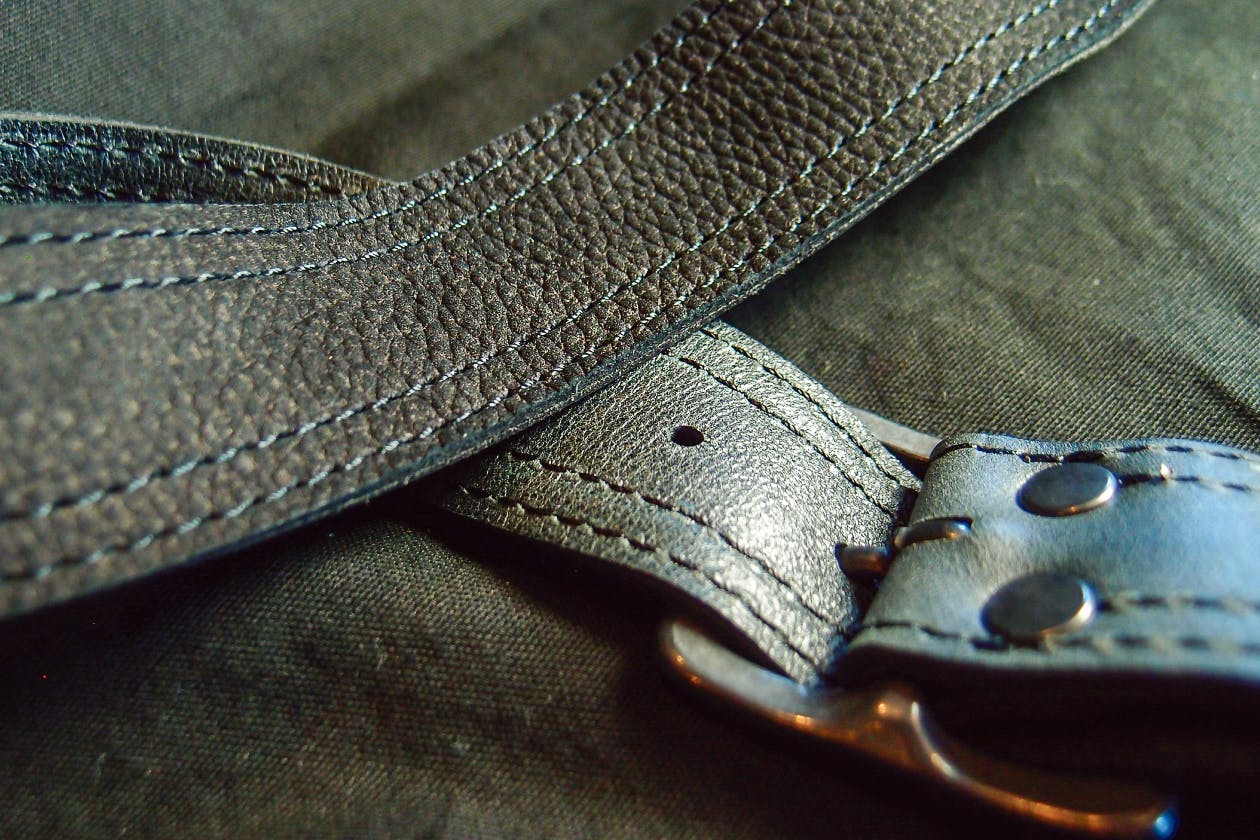 体に触れる部分は「ジェフウォール」表は「セザール」を張り合わせて製作しました。ベルト幅は40mm、長さは790~960mmの間で調整ができます。