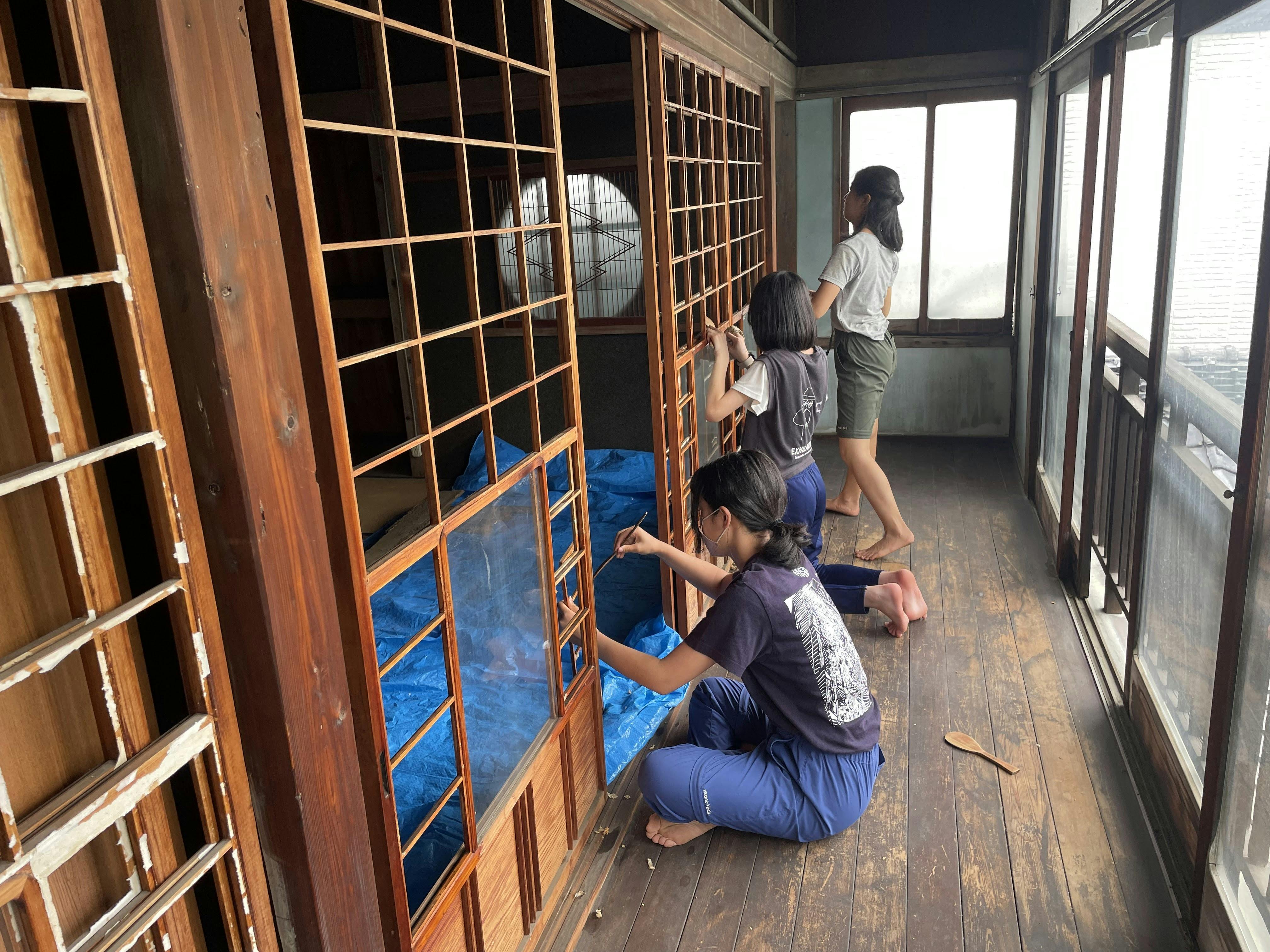 修理だけでなく、羽生特産・藍染ワークショップなどを開催し、メンバーの友人や子供達も参加し、楽しく活動できる工夫をしています。大人も子供も、古民家修理は初めて体験することばかり!雨染みでボロボロの障子をはがして、真っ白に貼り直すと、達成感で一杯です。「壊れても直せば使える」という実体験は、子供達にとって良い学びだと実感しています。
