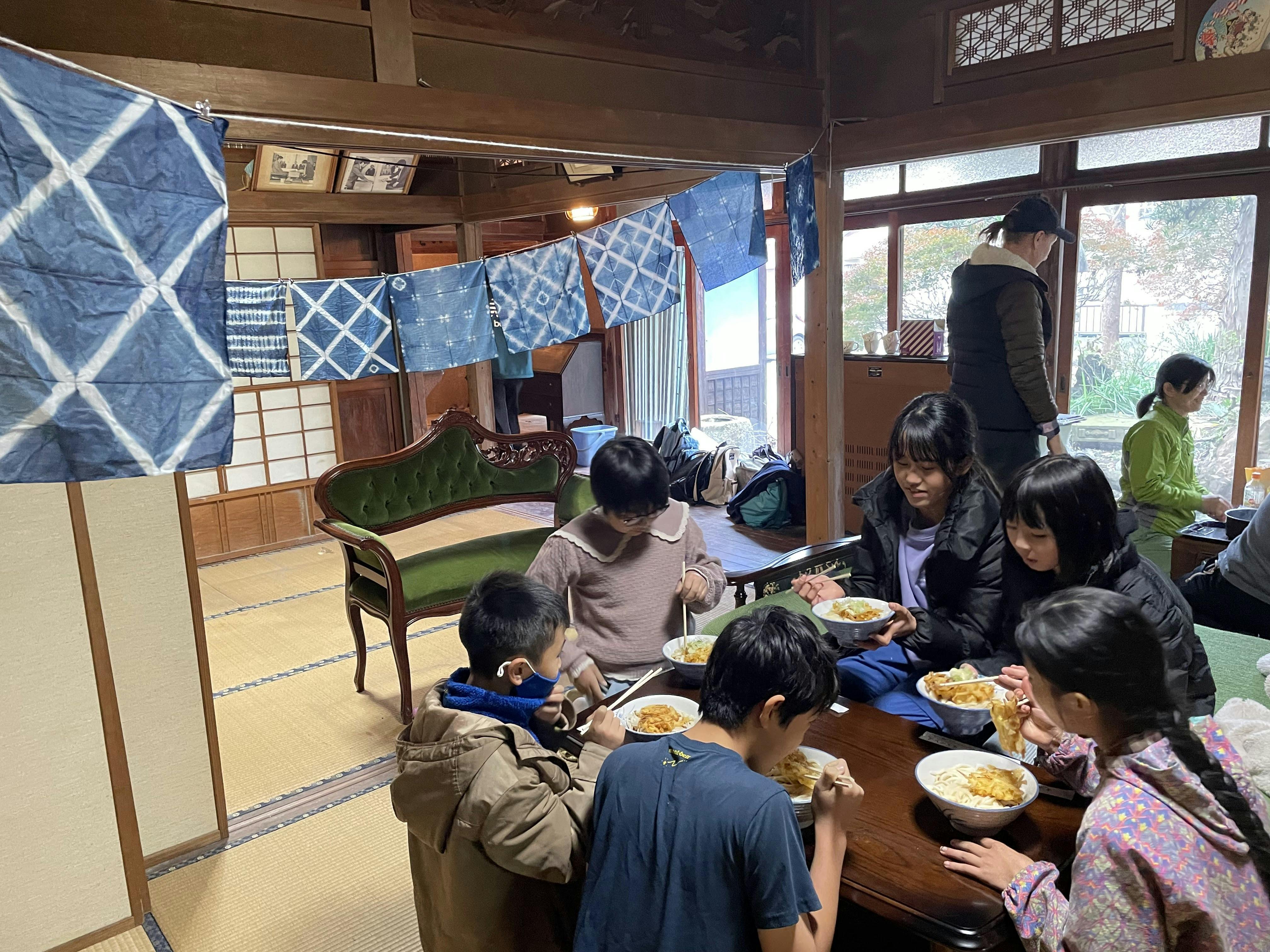 【これまでの改修作業や藍染ワークショップに子ども達も参加、みんなで食べるご飯やおやつは美味しい】