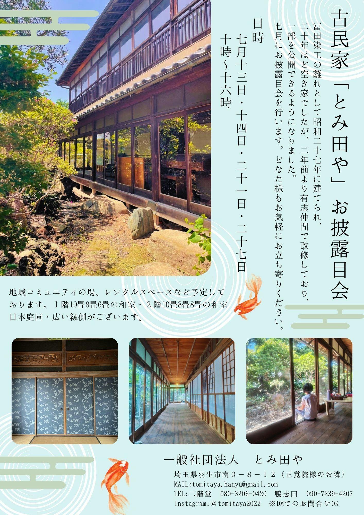 2024/07/07 11:18こんにちは、とみ田やです。今日は皆さんに大事なお知らせがあります。なんと、ついに、やっと、とみ田やお披露目会を行えることになりました!!7月13日(土) 10時~16時にオープンを予定しています。当日は、400年の伝統「羽生てんのう様祭り」が開催され、11基のみこしと2台の山車が市内を練り歩くそうです。とみ田やの前を通ります。場所や、最新情報はインスタグラムをご確認おねがいいたします。@tomitaya2022https://www.instagram.com/tomitaya2022/まだ建物の修理は続いていますが、多くの仲間に作業して頂いたおかげで、一階部分はだいぶ整ってきました。多くの方にお越しいただき、とみ田やの素敵な建物の中で、その良さを体感して頂きたいです。そして、知って頂くことで、とみ田やが色んな形で地域の活動場所になれたら、と思っています。先日発見した、とみ田やに残されていた掛け軸には、こう書いてありました。興来恣佳遊(心に興が湧いて来て、楽しい遊びを十分にする)なんて素敵な言葉。これが実現できる場所になりたいと思います。冨田家ご先祖様と想いは同じだと思うと、ここまでやってきたことは、必然だったのだと感じます。皆さまのお越しをお待ちしております! もっと見る