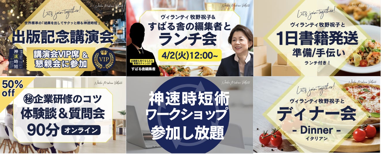 (ご紹介:上段左から時計回りに)セミナーをすれば数百人が集まる人気講師 滑川周平さん&すばる舎敏腕編集者がゲスト登壇する祝子の出版記念講演会&懇親会のチケット、出版のアドバイスがもらえる!すばる舎編集長とランチ会(4/2は売り切れ、4/3分はまだお席あり!)、祝子の自宅でワイワイしながら1日書籍発送準備(ランチ付)、ミラノ在住の祝子と一緒に楽しくイタリアワイン&イタリアンを楽しむ会、神速時短術ワークショップ(各5000円)を受け放題!、企業研修のコツ、リアル体験をアレもコレも交えて全部教えちゃいます!(90分)。