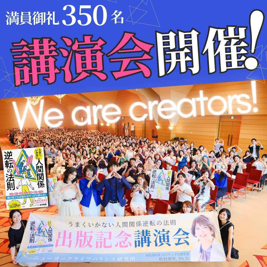 開催日:2024年7月7日(日) 13:00〜15:00会場:東京アメリカンクラブ(東京都港区)来場者数:約350人ポジティブ心理学者でニューヨークライフバランス研究所代表、松村亜里の6冊目の新刊「うまくいかない人間関係逆転の法則」(すばる舎)の出版記念講演会が、東京アメリカンクラブで開かれました。国内外から、総勢350人もの方々がご参加! 嬉しい「満員御礼」となりました。日本未公開となる、とっておきのメソッドをいち早く体験。幸福感が会場いっぱいに満たされた、感動の講演会をリポートします。◆開場前から、同窓会さながらの賑わい東京アメリカンクラブのシンプルかつ気品漂うエントランスから、落ち着いた雰囲気のエスカレーターを下ると、華やかな会場に到着します。受付では、みなさん少し緊張した面持ちでしたが、開場が迫るころには、まるで同窓会!北は北海道、南は沖縄から。さらに海外からは、アメリカ、フランス、イタリア、タイなど。日本中、世界中から、この日のために多くの方が駆け付けてくださいました。松村を通じてご縁のあった方々同士、直接会える絶好のチャンス。近況報告をし合ったり、本の出版を喜び合ったり、話が尽きない様子。いつもはオンラインの画面越しでしか会えなかった皆さんと、リアルで集えたことで、感激もひとしおでした。またそこから、新しい出会いが生まれ、繋がっていく。そんな場が、開幕前から早くも生まれていました。◆ 笑顔あふれる多彩なブース会場ブース会場も、大変な盛り上がり!人間関係はもちろん、自己肯定感やキャリア、子育て、アロマの癒しなど、魅力的なテーマがズラリ。スタンプラリーやプレゼントなど、来場者に楽しんでいただけるよう、様々な趣向を凝らしました。来てくださった方たちからは「どのブースも楽しかった!」と喜びの声をいただきました。その中でも、とても興味深かったのが、「女性のパワーを感じた。今まで日本は男性社会だったけれど、 これからは女性が、こうして活躍していける時代になると実感できた」というご感想でした。今回出展した6つのブースは、いずれも女性が主催。共通点として「女性を応援していきたい」という思いがあったと思います。その気持ちが、来場者の皆さんにも伝わったのですね。希望に満ちた、笑顔あふれるブース会場でした。◆ 全員参加の記念講演会。幸福感が会場いっぱいに!「亜里さんに会うのは初めて!」「リアルの講演会は初めて参加」という方も多い中、記念講演会がスタート。明るい音楽と、参加者の温かい拍手に包まれながら、講師の松村亜里が登場しました。「ポジティブ心理学とは?」というテーマから始まり、6冊目の著書である「うまくいかない人間関係逆転の法則」(すばる舎刊)について、より深くポイントを解説。さらに、ポジティブ心理学特有の「”ある”ものを見る」という視点について、松村自身の経験談を交えながら、参加者へエールを送りました。解説を聞くだけでも大満足なのですが、この講演会の最大の特徴は、全員参加型の「ワークショップ」があること!まずは、前述のテーマについて理解を深めた後、3人グループに分かれ、そのテーマに関するお話をしていただきました。ここで大切になるポイントが、ACR(積極的建設的傾聴)。※ACRについては、 ポジティブ心理学コンサルタント養成講座の開催報告を参考にしてください。 https://ameblo.jp/arimblog/entry-12852766300.htmlこのACRを意識してワークショップを行うと、不思議に場の雰囲気が変わるのです。初めは戸惑いがあったものの、すぐに会場はたくさんの話し声で満たされ、アミューズメントパークのようなにぎやかさに!初対面の人が多かったにも関わらず、「幸福感が高まりましたか?」「隣の人をもっと好きになりましたか?」という問いに、皆さん笑顔で手を上げられていたことが印象的でした。講演会後半では、実際に「人間関係逆転の法則」を経験された、鈴木尚子さん、石原直樹さん、藤井直子さんの3名と、松村とのトークライブ。日常にあった、リアルな体験談を聞くことで、より具体的に理解を深めることができました。「人は、いつでもどこでも誰でも、幸せを作り出すことができる!」という松村の最後のメッセージは、それぞれの心に深く刻まれたことでしょう。たくさんの優しい笑顔で満たされた、温かい講演会。来場された皆さんの幸福度は、きっと倍増されたことと思います。◆成功裡に終えて(スタッフより一言)準備段階から、何度もミーティングを重ね、確認し合う日々。「妥協なく最高の場所を用意し、みなさんに最幸の1日を過ごしてほしい」という熱い想いと共に、イベント本番に臨みました。そして、スタッフ全員が「自分たちも全力で楽しむこと!」で、最高のイベントを企画・実施することができました。松村が大切にしている「No one left behind(誰一人取り残さない)」というポリシー。誰かが我慢するのではなく、やりたい人がやって、楽しむこと。これが
