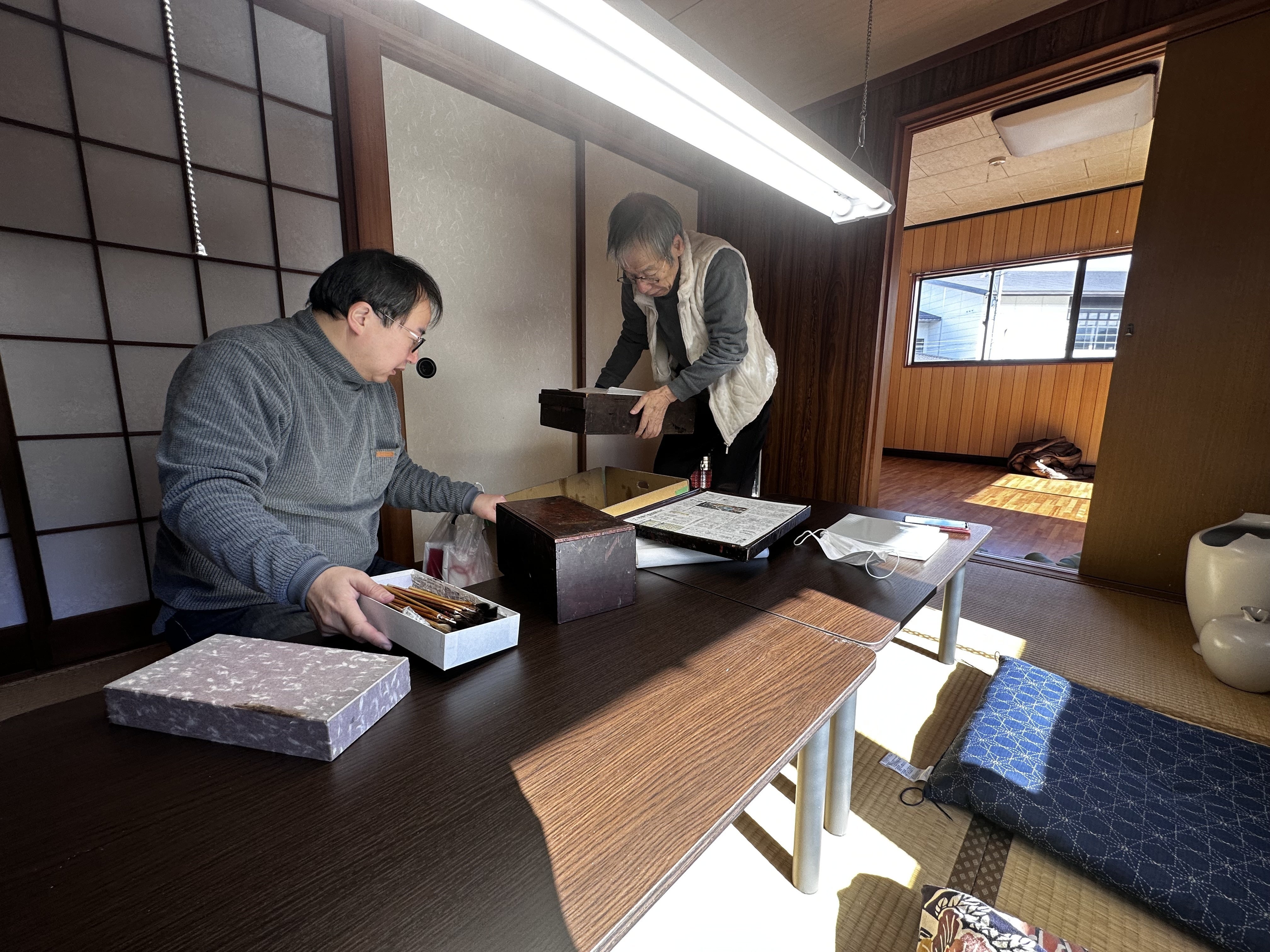 そのような状況下で、先日、能美市にあるCACL内に一つ目の仮設工房の整備が完了し、輪島塗の職人、江端俊雄先生・江端博行さんが入られました。