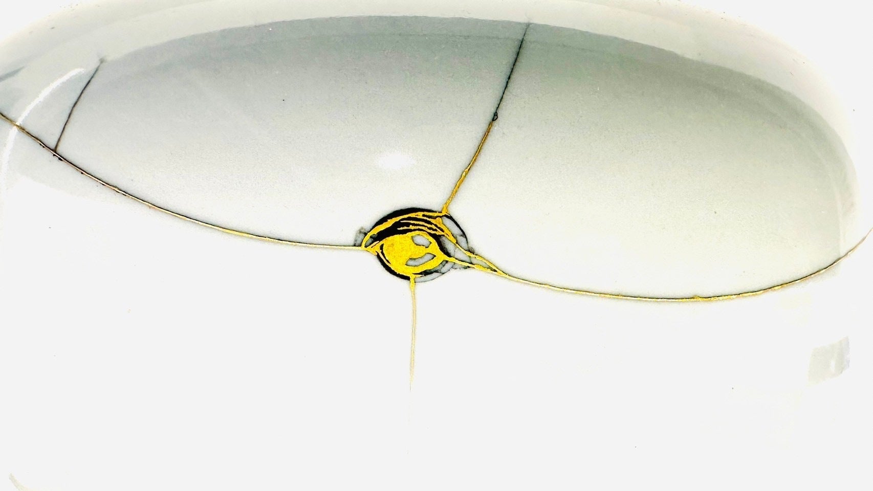 元日に起きた能登半島地震で割れた九谷の壺に、輪島の蒔絵師である江端俊雄先生、江端博行先生が筆を入れ、新たな美を創造しました。