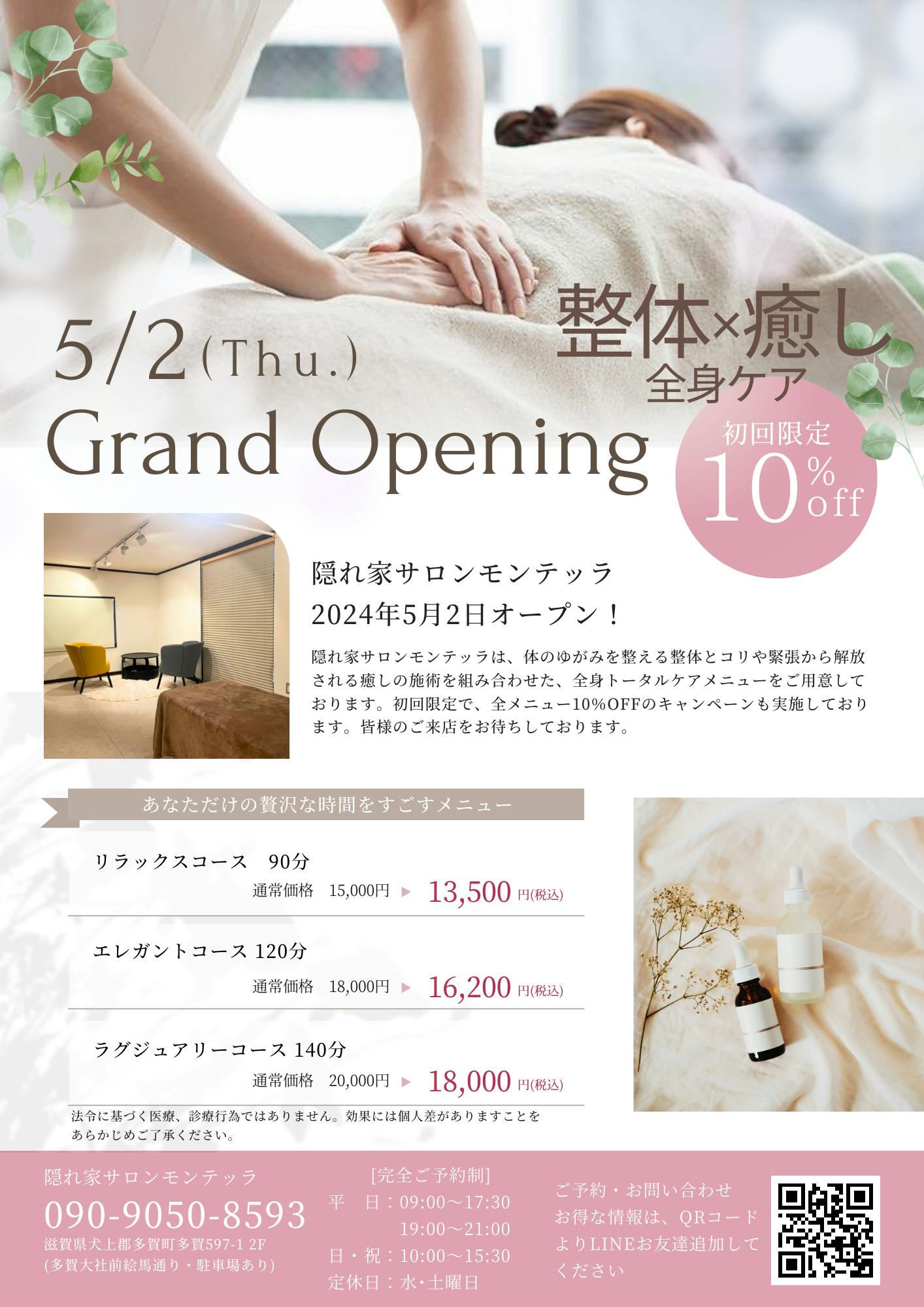 これらのお声から、お客様が体と心にゆったり寄り添える隠れ家サロンのような贅沢な時間と空間を提供するため、完全予約制で安心安全な環境が適していると考えました。