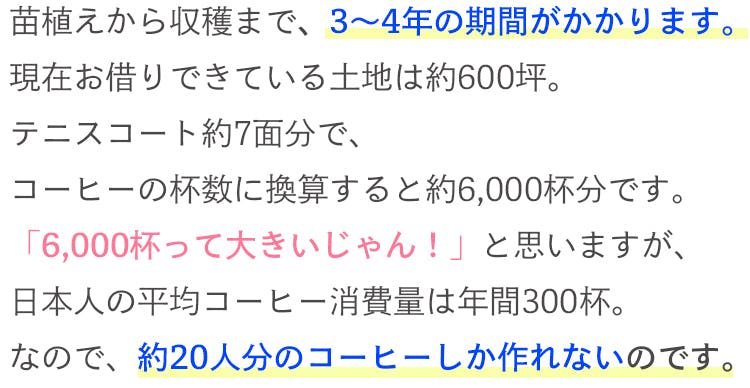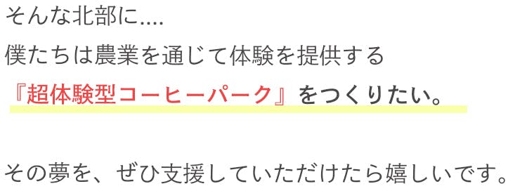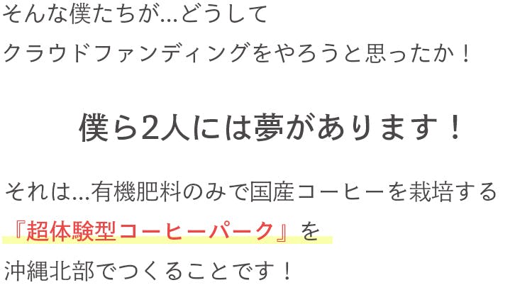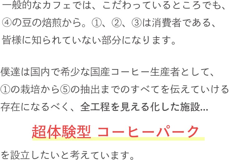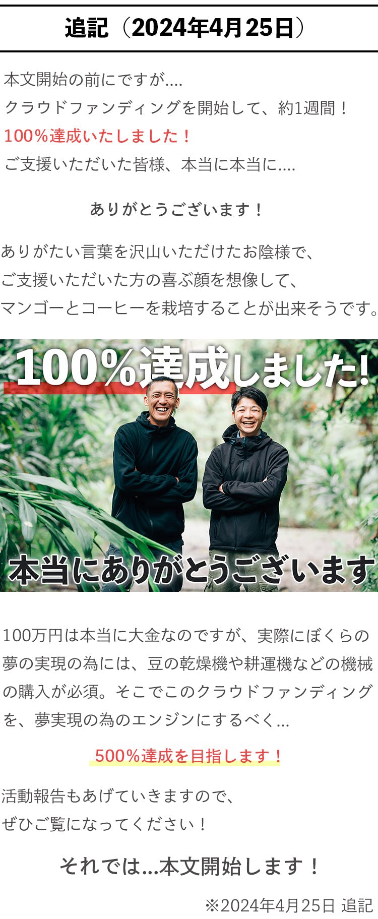 2024/04/25 18:03IRIE FARM代表の矢田です!17日(水)に開始して1週間....なんと...!100%達成いたしました!本当にありがとうございます!支援金が集まったこと以上に、このクラウドファンディングを通じて連絡させていただいた、友人、親戚、先輩方などなどから「応援してるよ!」「すごい!相変わらずチャレンジしてるね!」などなどの応援をいただけたことが何よりも嬉しかったです。支援してくださった方も、応援をいただいた方も本当にありがとうございます!まだまだ通過点ではありますが、農家として誇りを持って商品を送り出せるように精一杯努力していきますので今後とも暖かいご支援よろしくお願い致します!100%達成(=100万円)は本当に大金なのですが、実際にぼくらの夢の実現の為には、豆の乾燥機や耕運機などの機械の購入が必須。そこでこのクラウドファンディングを、夢実現の為のエンジンにするべく...500%達成したいです!まだまだご支援いただけたら本当にうれしいので、引続きよろしくおねがいします! もっと見る